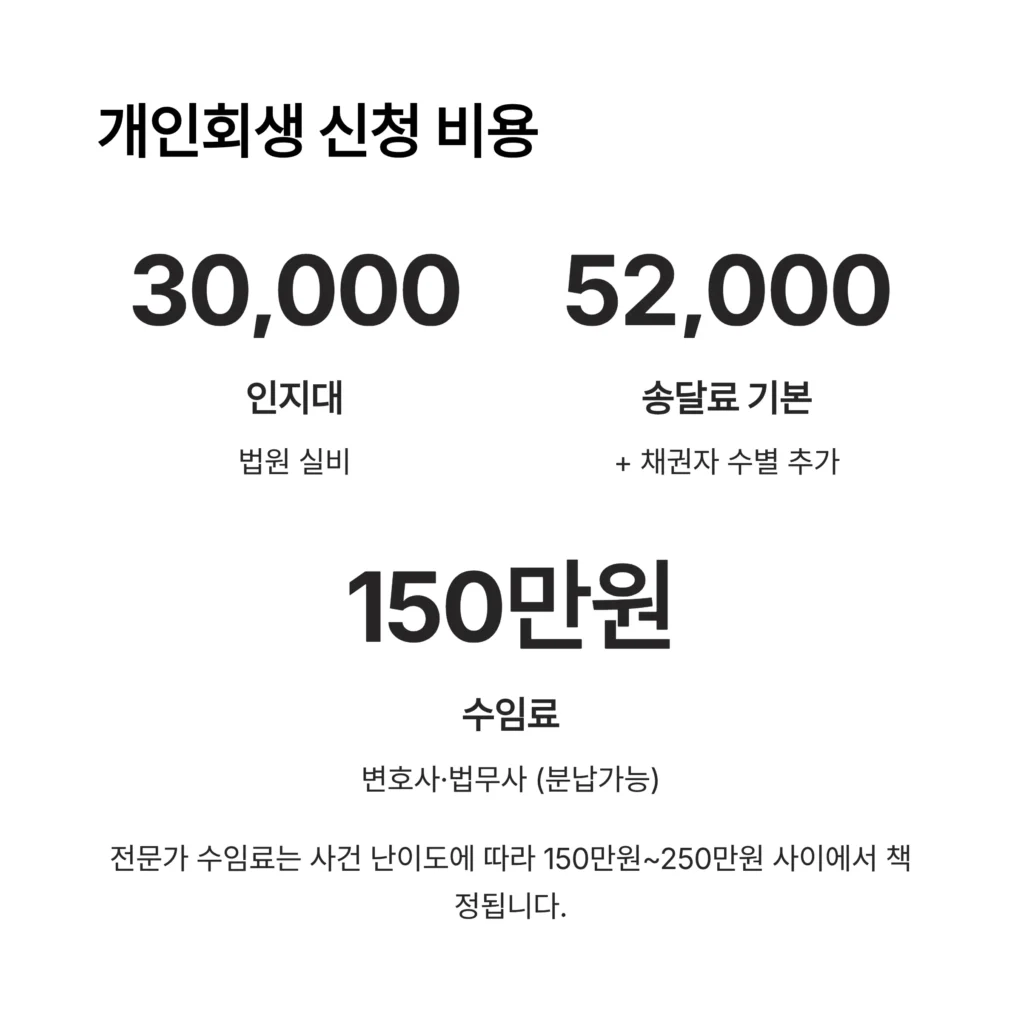 - 변호사/법무사 수임료: 사건의 난이도에 따라 다르지만 보통 150만 원 ~ 250만 원 사이에서 책정됩니다. (분납가능)