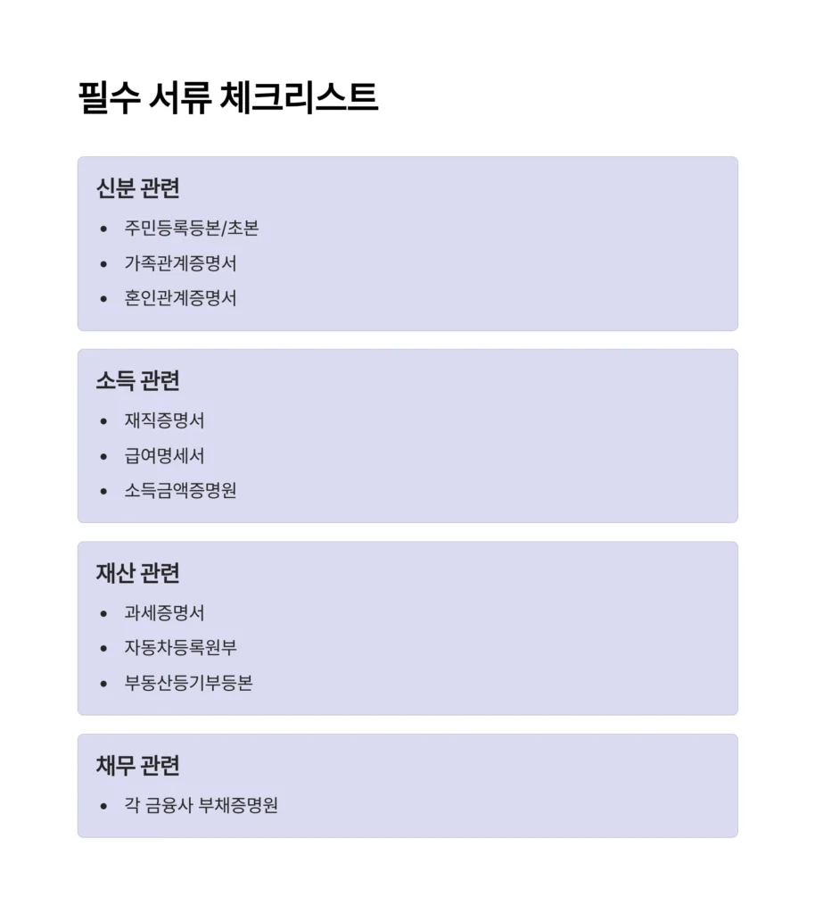 - 재산 관련: 지방세 세목별 과세증명서, 자동차등록원부, 부동산등기부등본, 보험 해약환급금 증명서 등