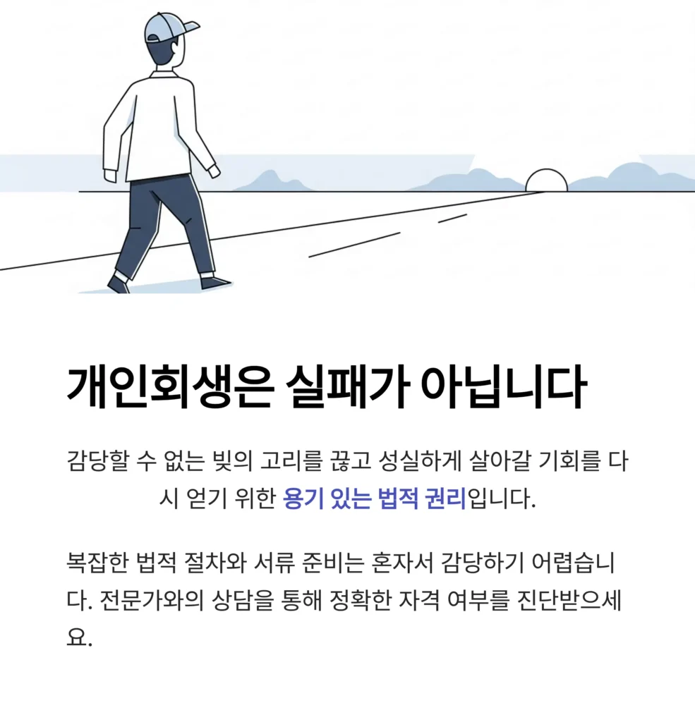 개인회생은 결코 실패가 아닙니다. 감당할 수 없는 빚의 고리를 끊고 성실하게 살아갈 기회를 다시 얻기 위한 용기 있는 법적 권리입니다.