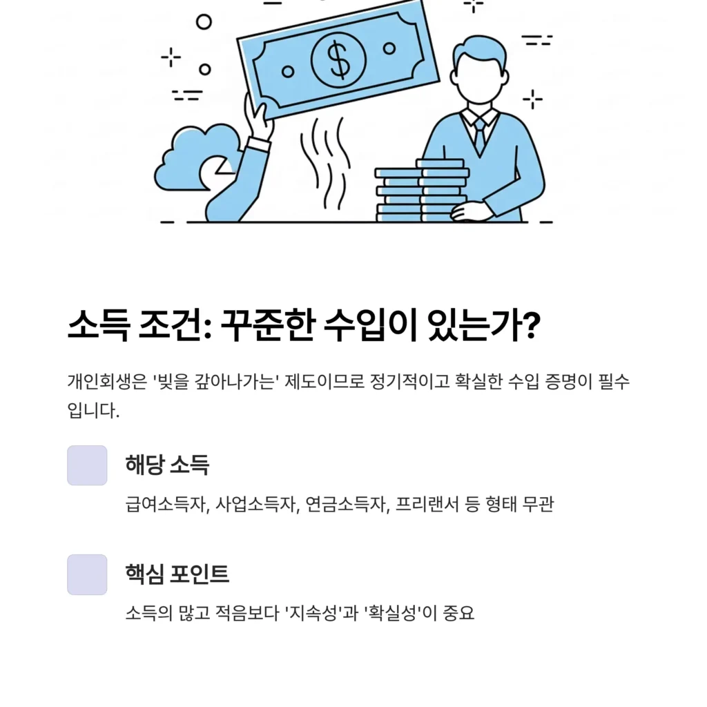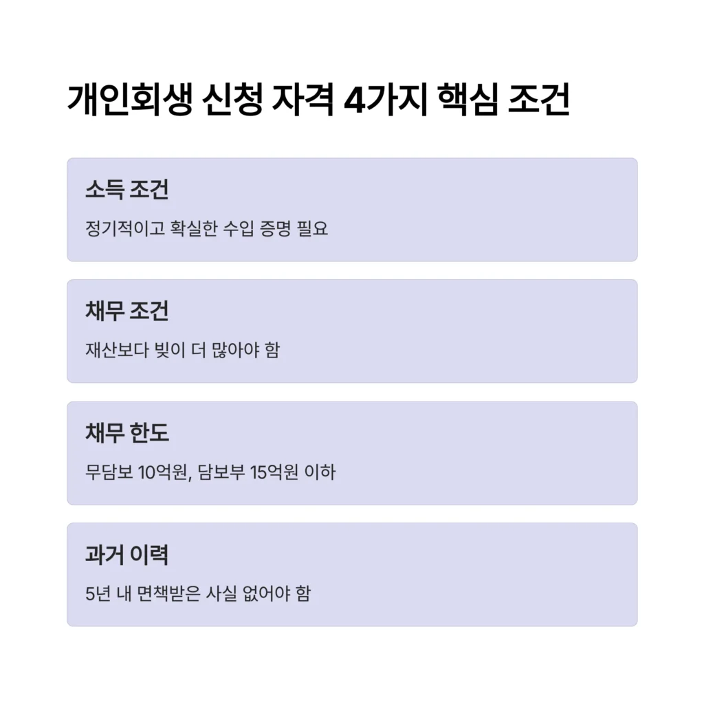 가장 먼저 내가 개인회생을 신청할 수 있는 자격이 되는지 확인해야 합니다. 아래 4가지 핵심 조건을 모두 충족해야 합니다.