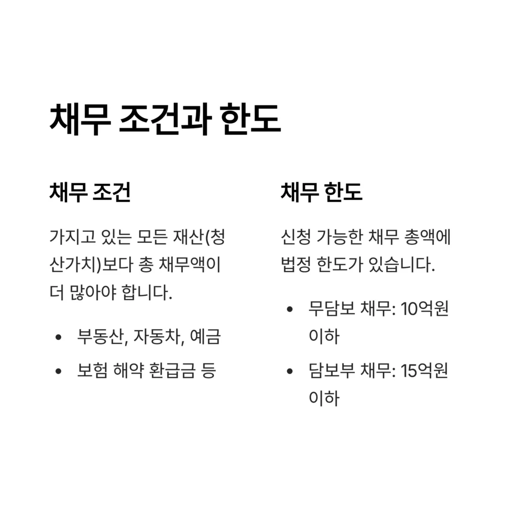 - 무담보 채무: 신용대출, 카드론, 사채 등 담보가 없는 빚은 10억원 이하
