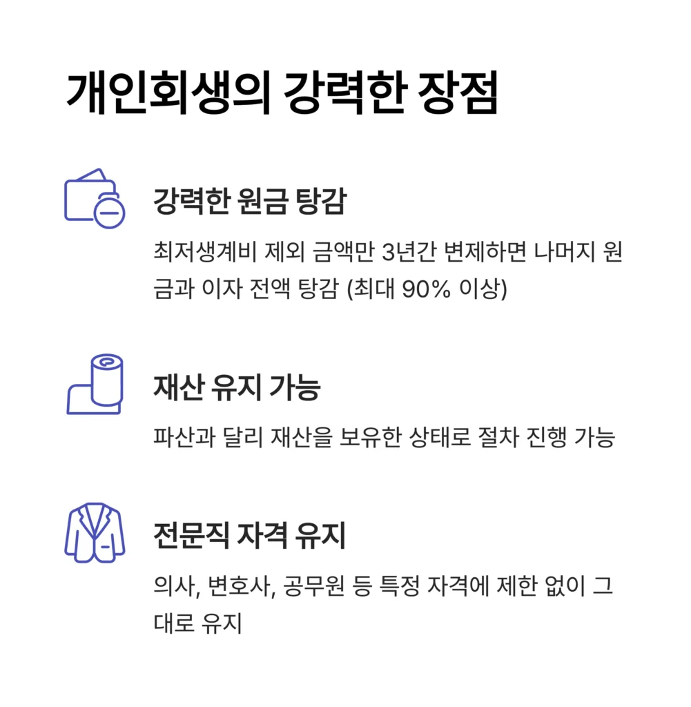 | 장점 | 강력한 원금 탕감, 재산 보유 가능 | 모든 빚 전액 탕감(면책 시) | 비교적 간단한 절차 |