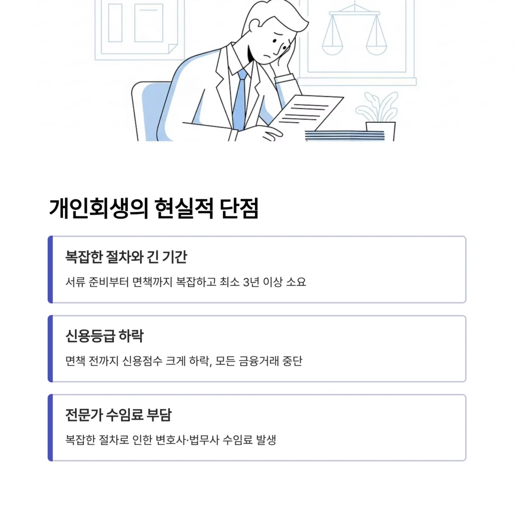 - 복잡한 절차와 긴 기간: 서류 준비부터 면책까지의 과정이 복잡하고 최소 3년 이상이 걸립니다.