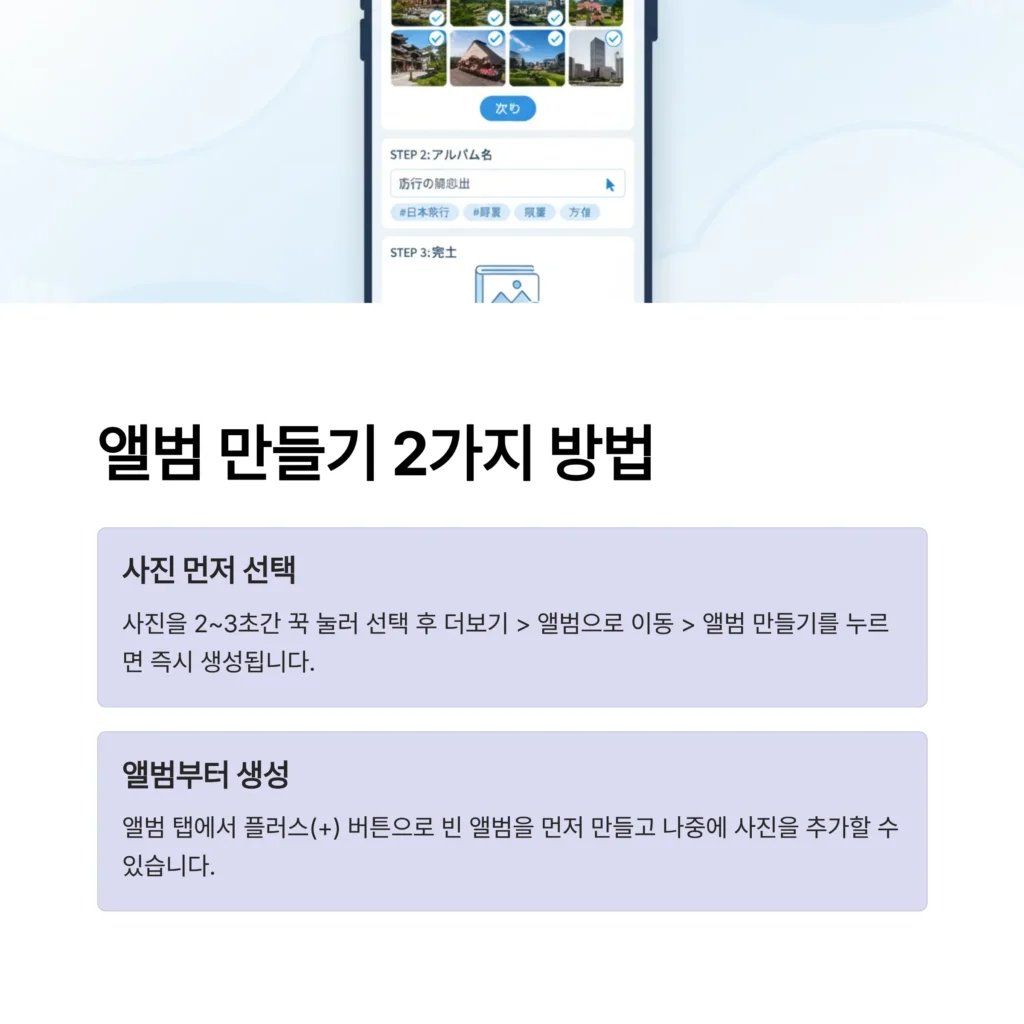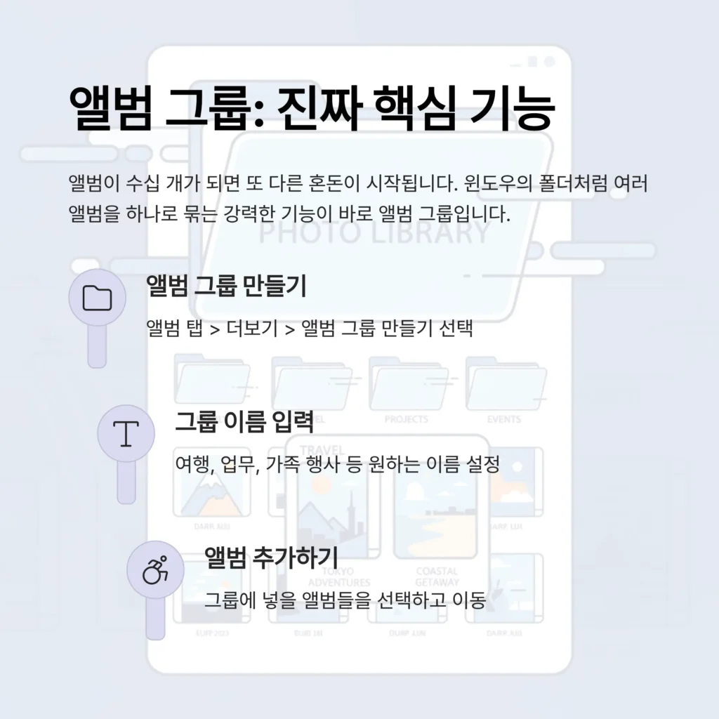 이 단계만 마쳐도 갤러리가 훨씬 정돈된 느낌을 받을 수 있습니다. 하지만 진짜 핵심은 단순히 앨범을 만드는 것을 넘어 앨범들을 어떻게 체계적으로 관리하느냐에 있습니다.
