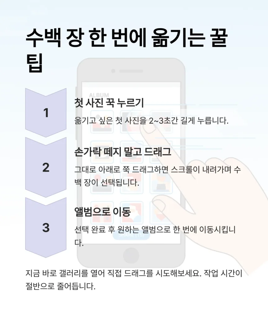 옮기고 싶은 첫 사진을 꾹 누른 상태에서 손가락을 떼지 말고 그대로 아래로 쭉 드래그해보세요. 스크롤이 내려가면서 수백, 수천 장의 사진이 순식간에 선택됩니다. 이 방법을 알면 일일이 사진을 탭하느라 손가락 아플 일이 사라지죠. 지금 바로 갤러리를 열어 직접 드래그를 시도해보세요.