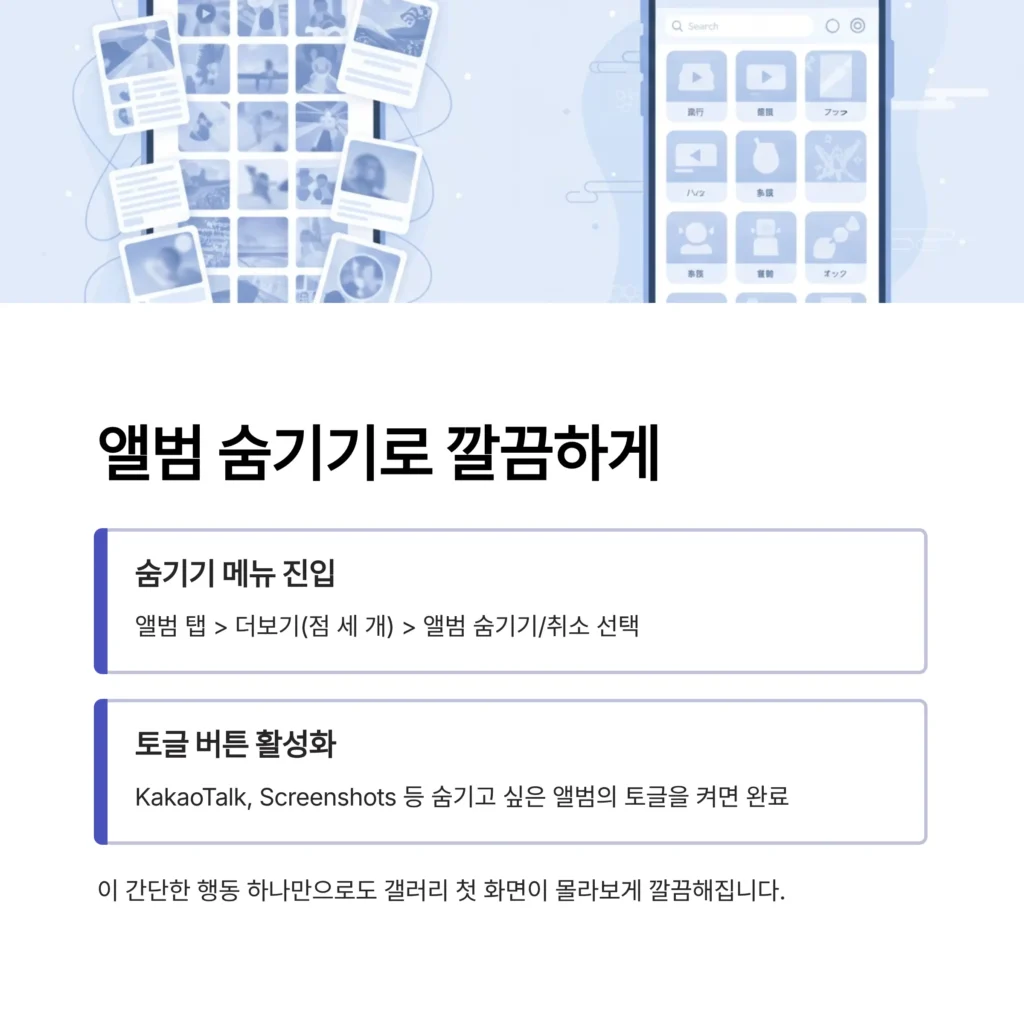 갤러리 첫 화면을 어지럽히는 KakaoTalk, Screenshots 앨범이 눈에 거슬렸나요? 아래 방법으로 간단히 숨길 수 있습니다.