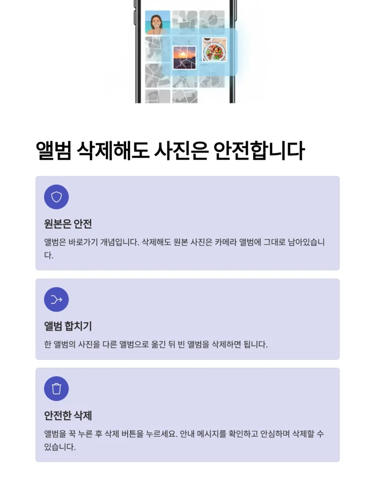 삭제할 앨범을 2~3초간 꾹 누른 후 삭제 버튼을 누르세요. 사진이 삭제되지 않는다는 안내 메시지를 확인하고 안심하며 삭제할 수 있습니다.