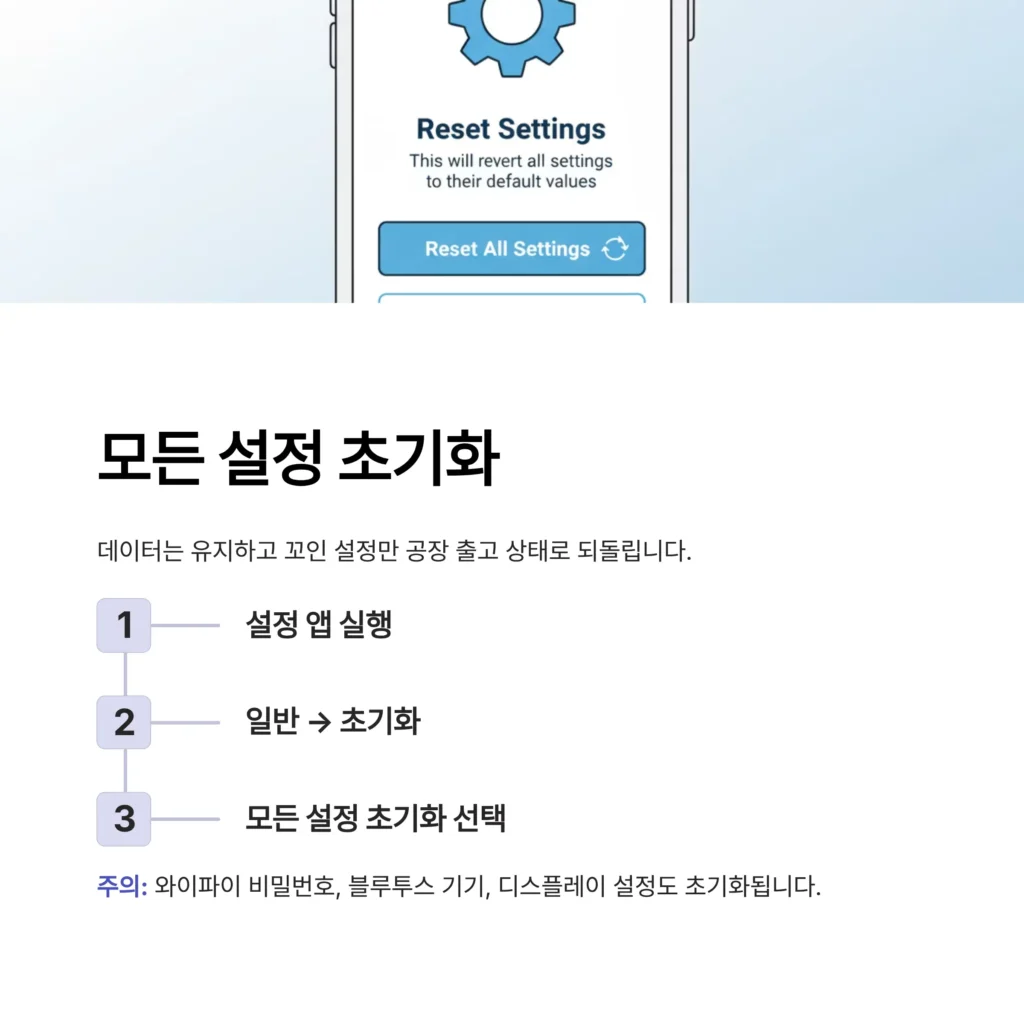 • 모든 설정 초기화 하기: 사진, 연락처, 앱 등 내 소중한 데이터는 그대로 유지하고 꼬여버린 설정만 공장 출고 상태로 되돌리는 방법입니다.