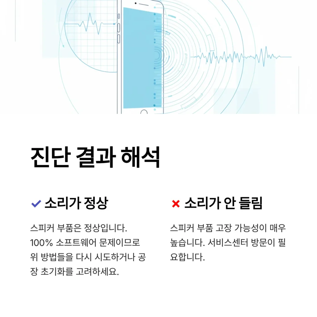 테스트 음악이 전혀 들리지 않거나 소리가 찢어진다면 스피커 부품 자체의 고장일 확률이 매우 높습니다. 이때는 서비스센터를 방문하여 수리를 하셔야 합니다.
