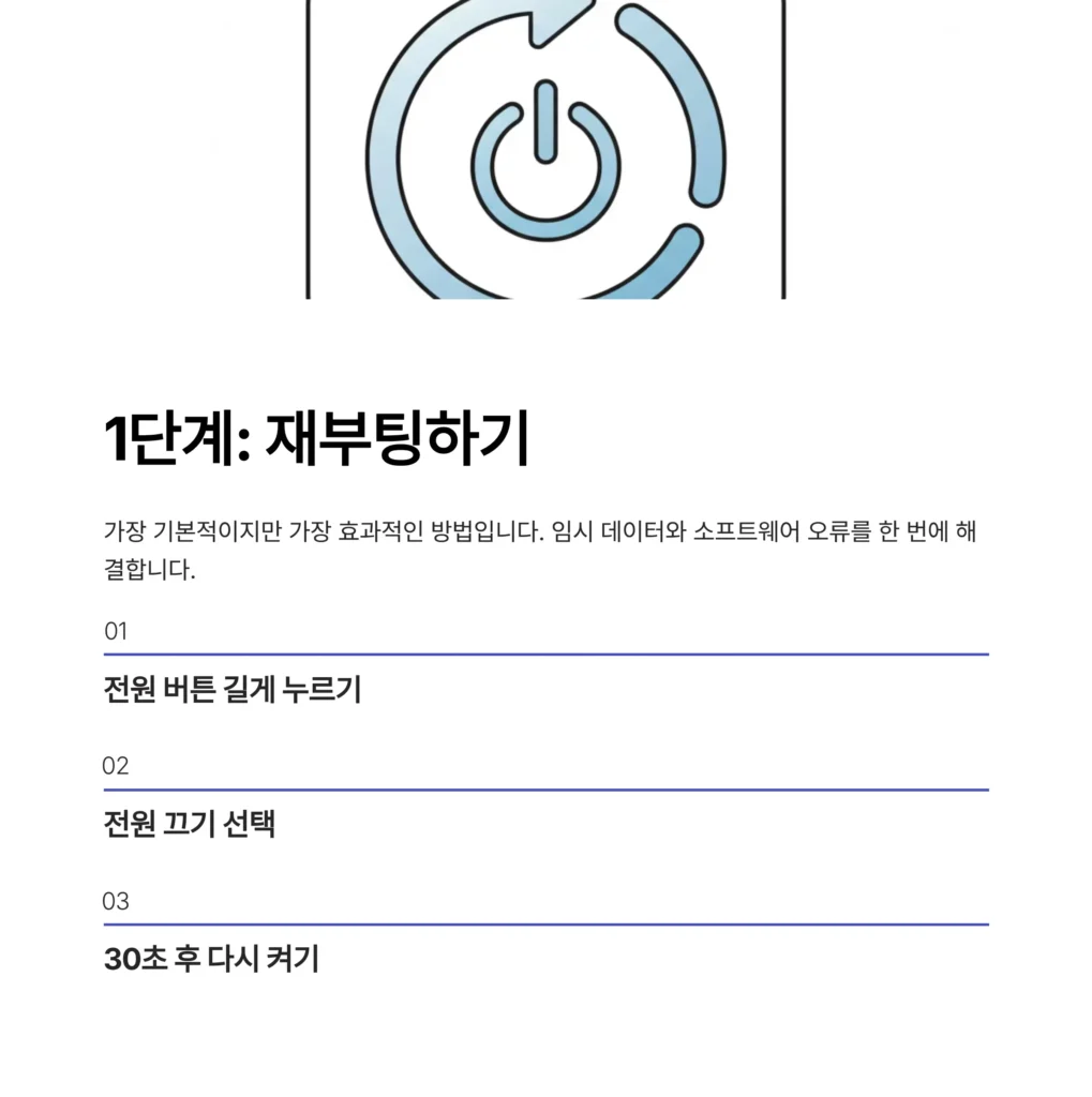 스마트폰을 오래 켜두면 임시 데이터(캐시)가 쌓이거나 소프트웨어가 일시적으로 꼬일 수 있습니다. 재부팅은 이러한 문제들을 가장 간단하게 해결하는 컴퓨터의 껐다 켜기와 같은 가장 효과적인 응급처치입니다.