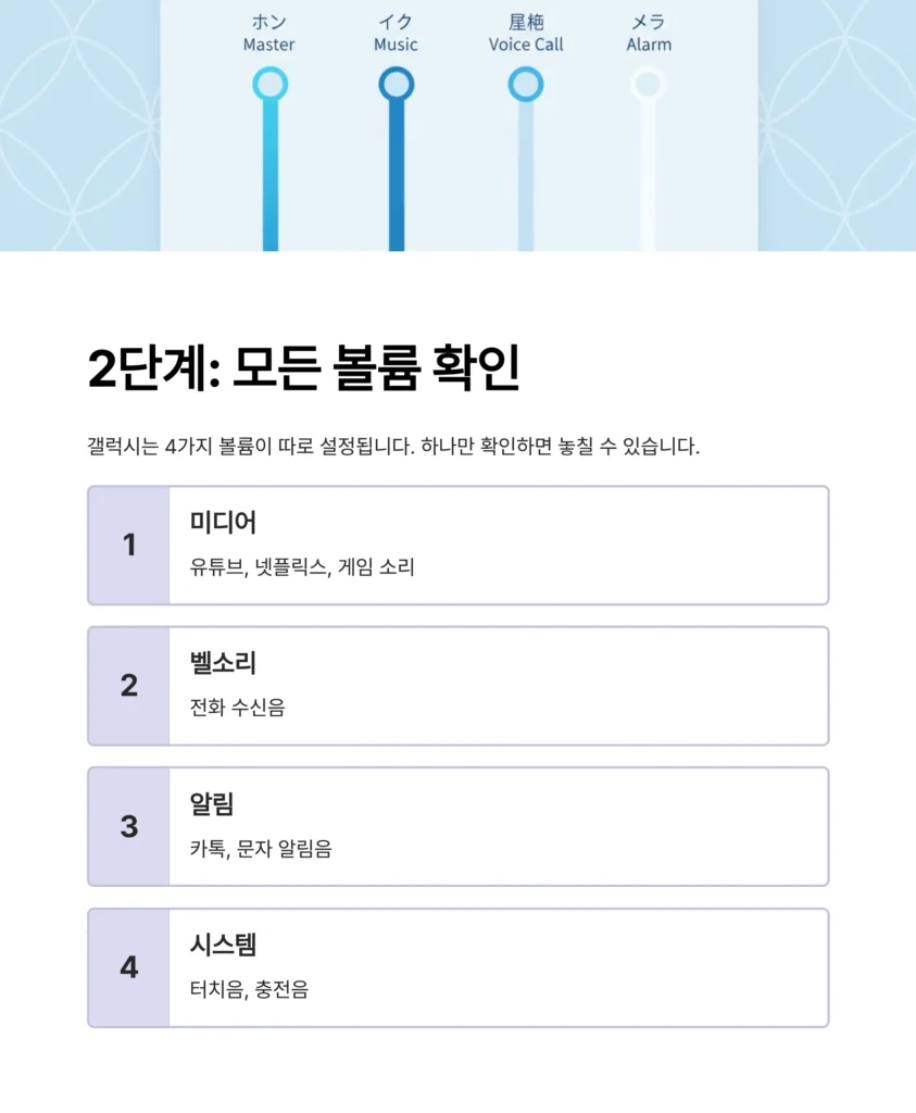 분명 볼륨을 최대로 올렸는데 왜 소리가 안나지? 라고 생각하신다면 이 부분을 꼭 확인해야 합니다. 갤럭시는 소리의 종류에 따라 볼륨이 4가지로 나뉘어 있습니다.