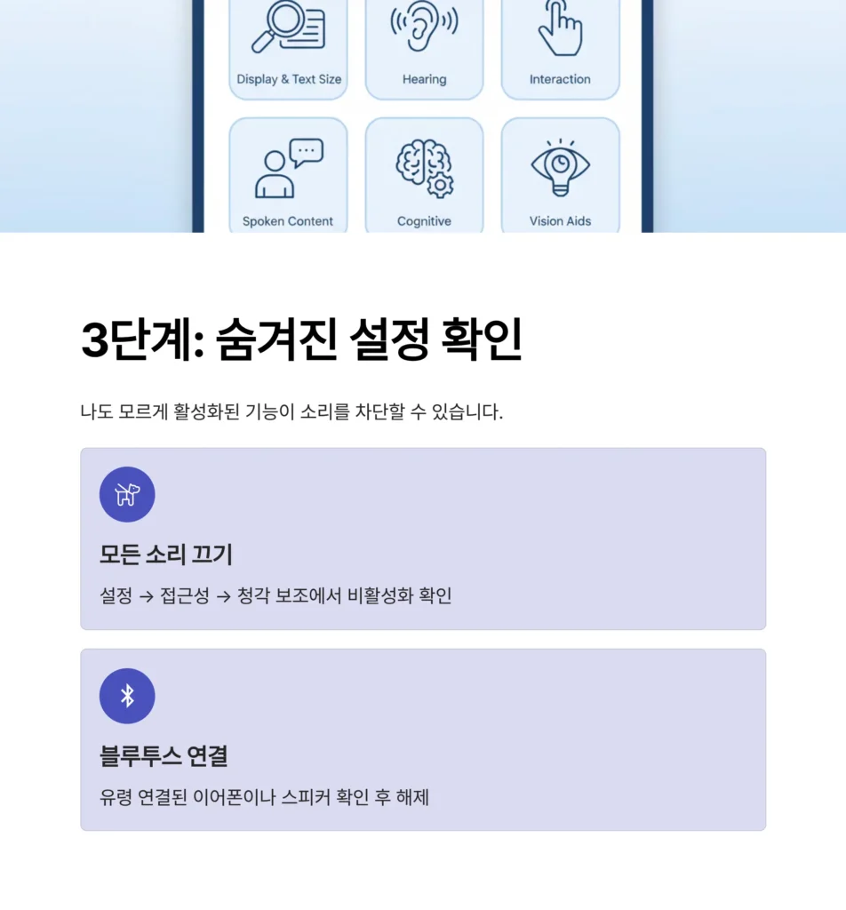 • 앱 자체 설정 확인: 해당 앱(특히 게임) 내의 설정 메뉴에 들어가 사운드나 알림 옵션이 꺼져 있는지 확인합니다.