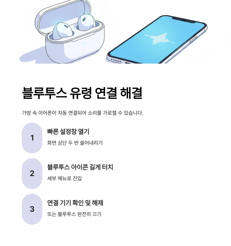 가방 속 블루투스 이어폰이 케이스 안에 있더라도 간혹 페어링이 완전히 끊기지 않아 유령 연결 상태로 남아있을 수 있습니다. 이 경우 스마트폰은 소리를 이어폰으로 보내고 있다고 착각합니다.