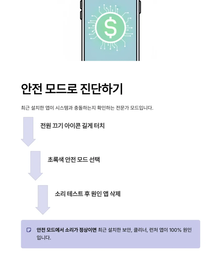 • 안전 모든에서 소리가 정상적으로 들린다면 최근에 설치한 앱 (특히 보안, 클리너, 런처 앱 등)이 100% 원인입니다. 의심되는 앱들을 삭제한 후 다시 일반 모드로 재부팅하여 확인해보시면 됩니다.