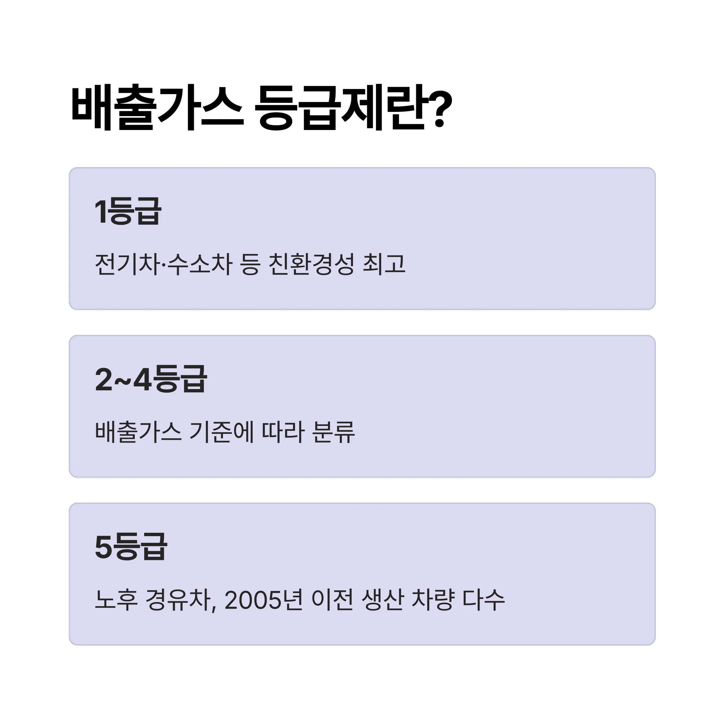 우리나라에서는 자동차의 배출가스와 연비 성능을 기준으로 1등급부터 5등급까지 차량에 등급을 부여합니다. 1등급은 전기차·수소차처럼 친환경성이 가장 높은 차량이며 5등급은 배출가스가 가장 많이 나오는 노후 경유차가 대부분 해당됩니다.