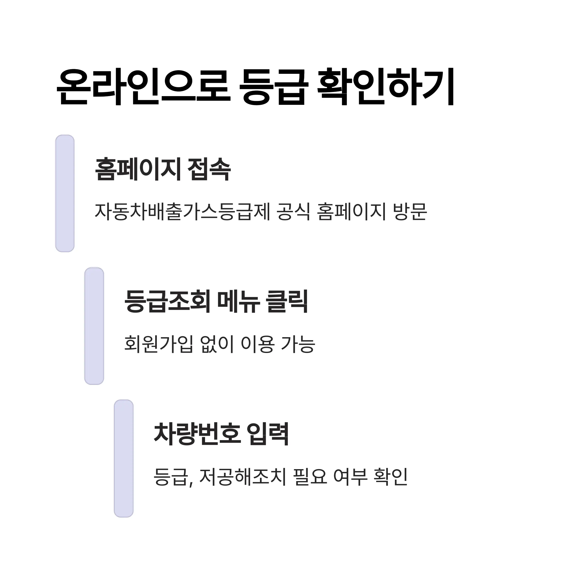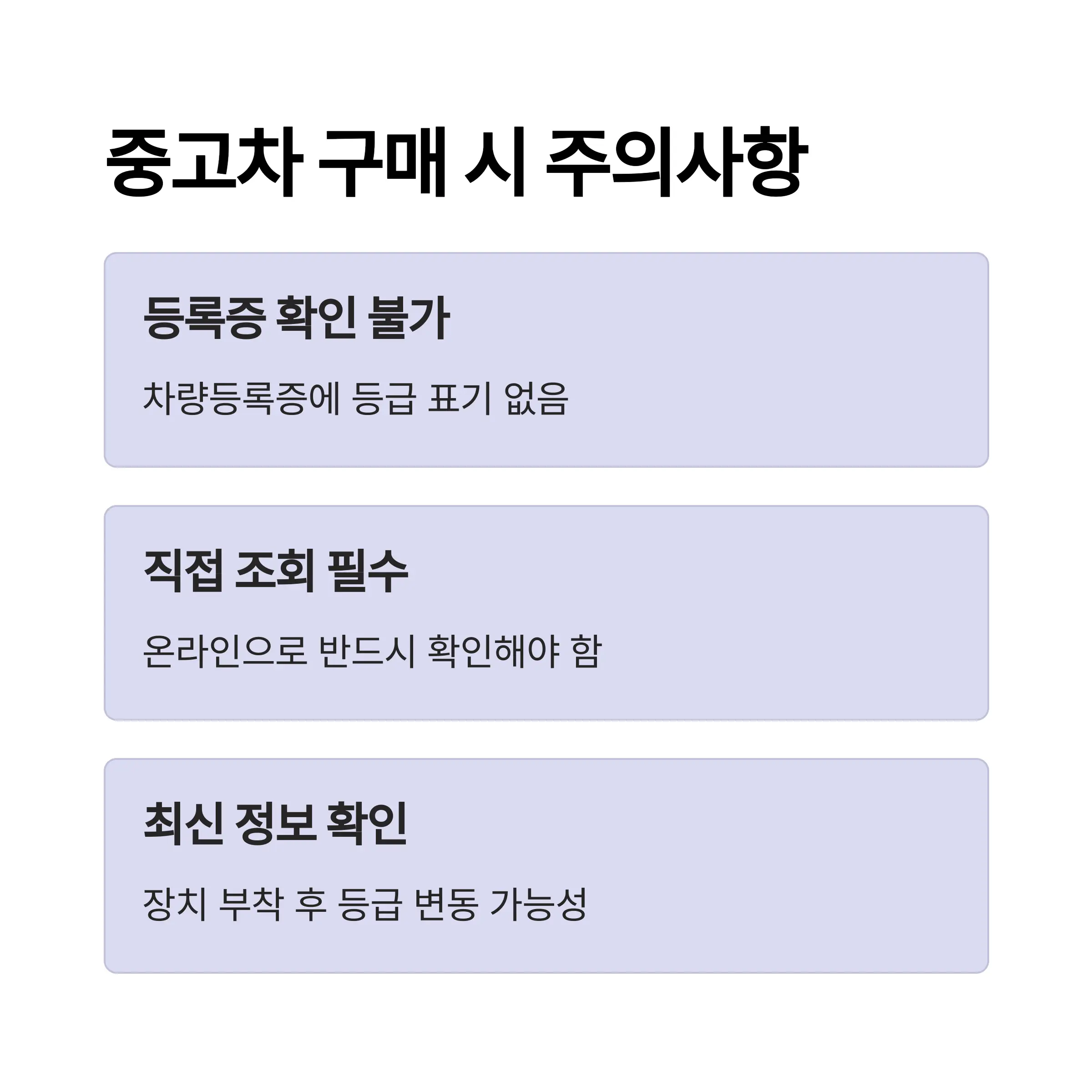 - 중고차 구매 시 차량등록증에 등급 표기가 없기 때문에 반드시 온라인으로 직접 조회해야 합니다.