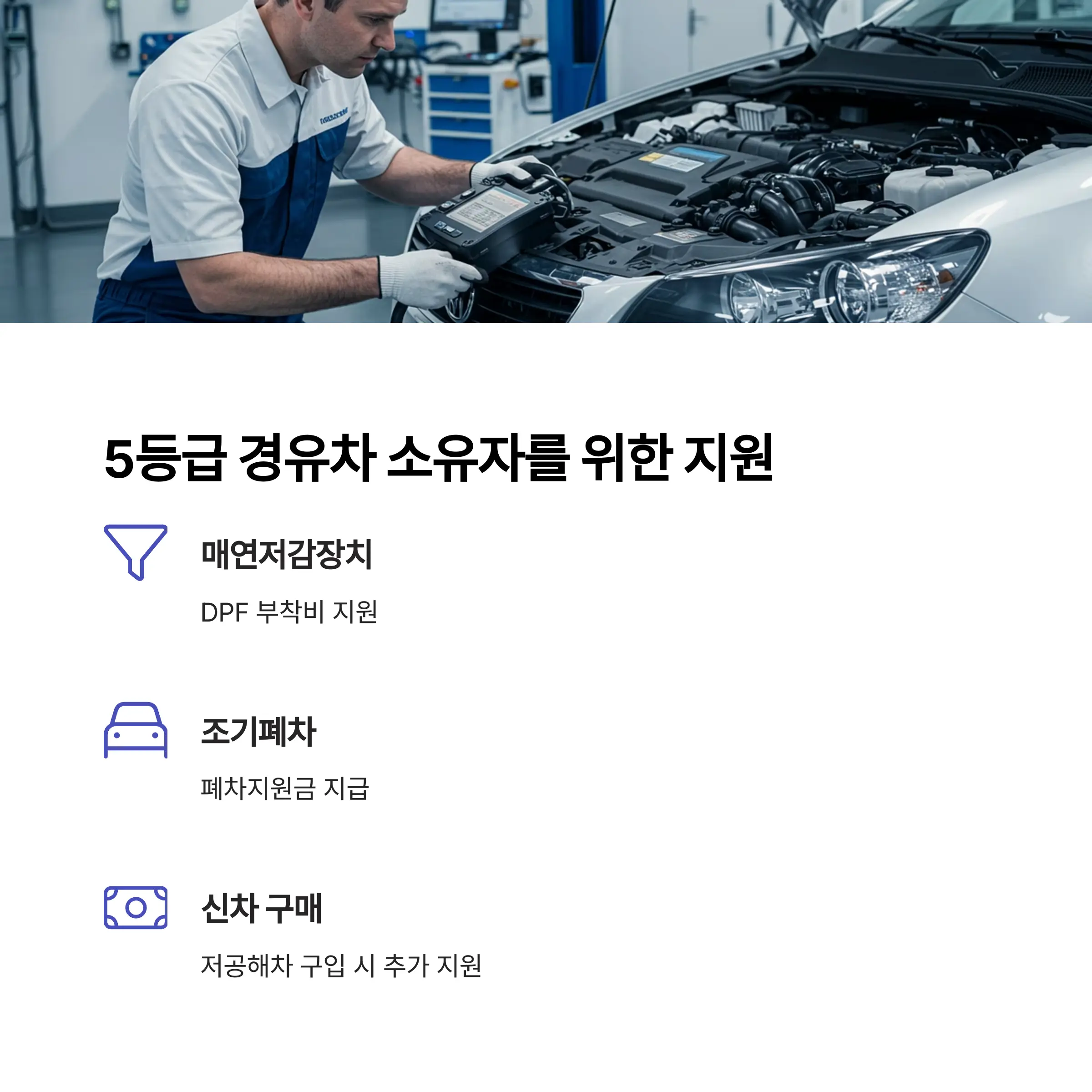 - 5등급 경유차 소유자는 지방자치단체별로 매연저감장치(DPF) 부착비 지원을 받을 수 있습니다.