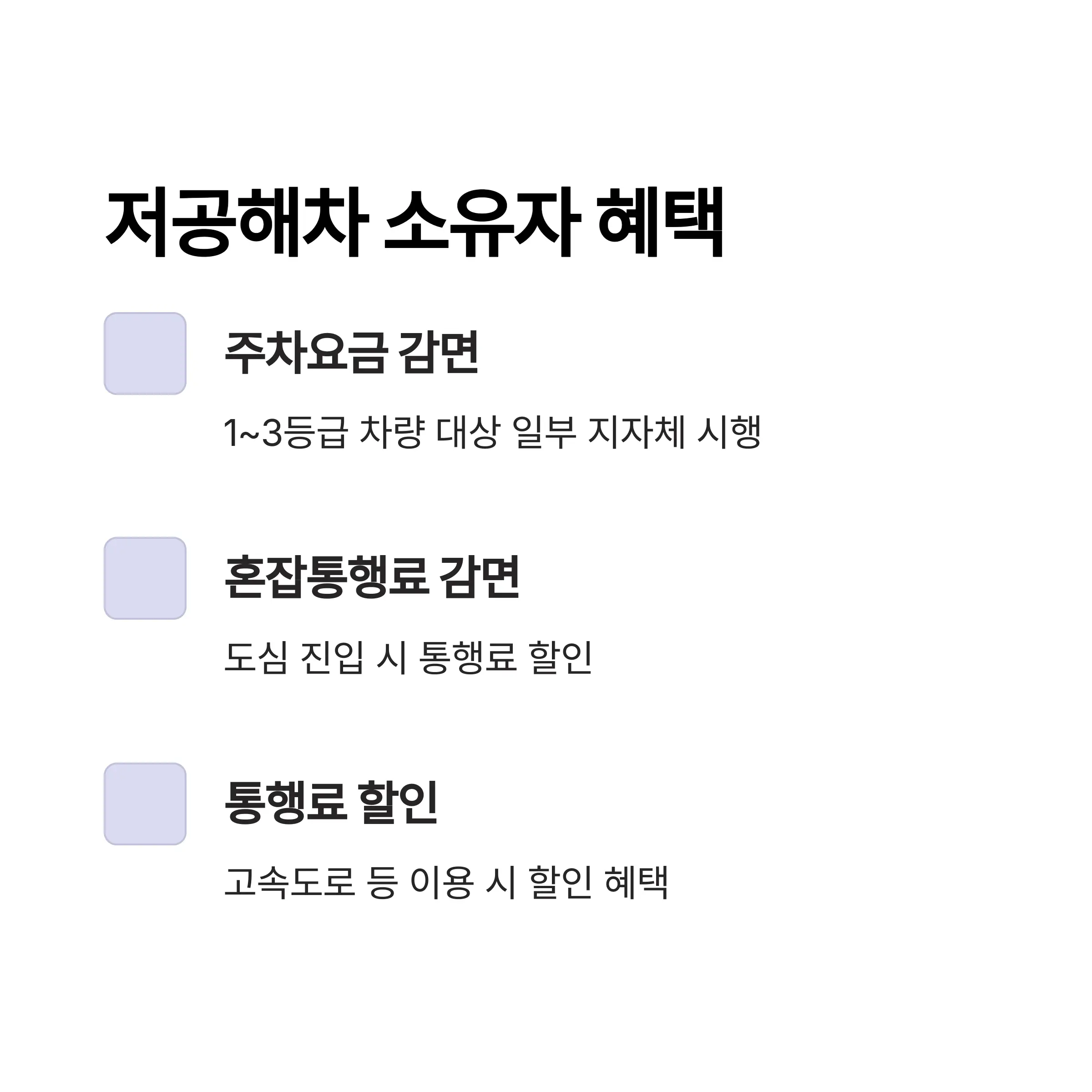 - 1~3등급 저공해차 소유자는 일부 지자체에서 주차요금 감면, 혼잡통행료 감면, 통행료 할인 등의 추가 혜택을 받을 수 있습니다.