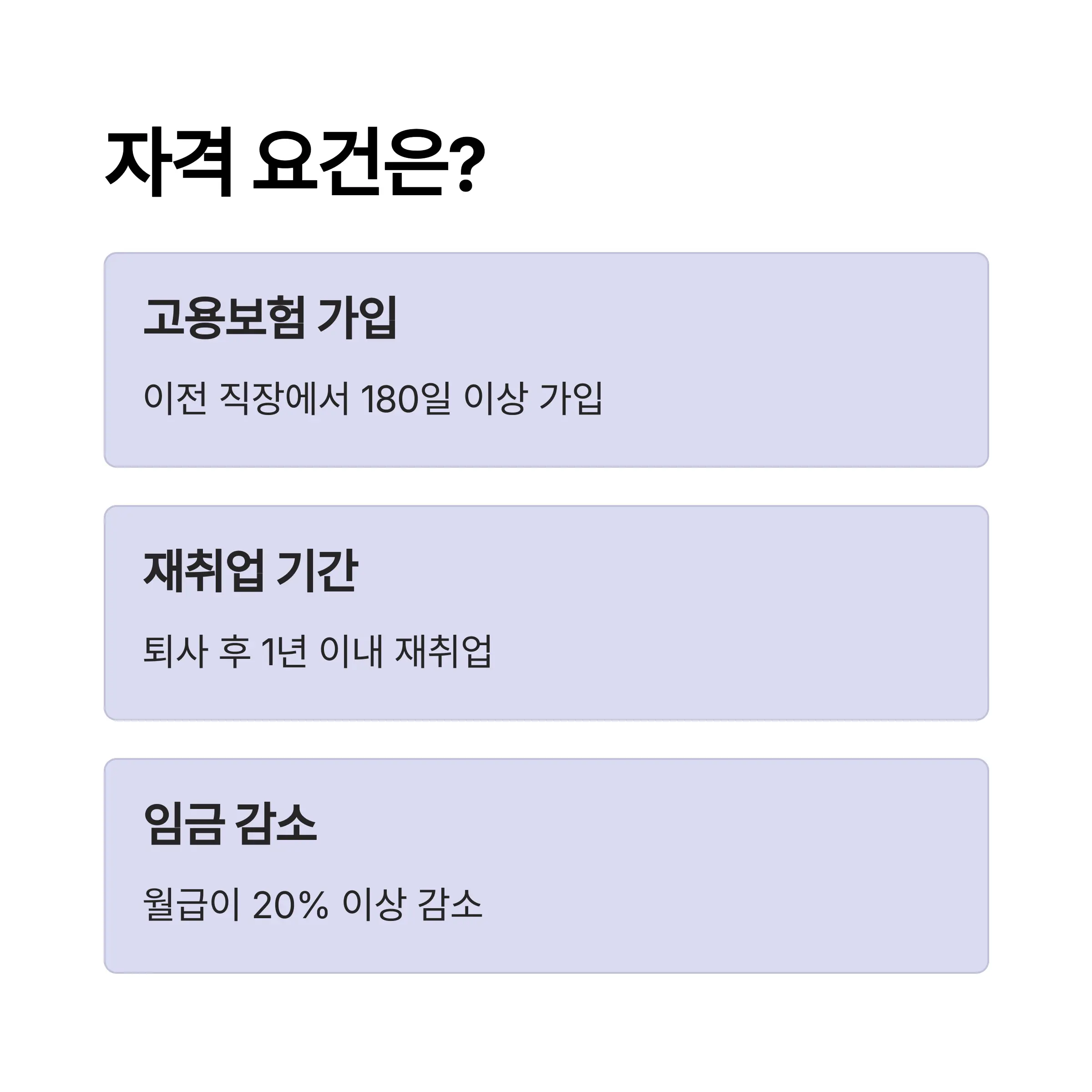 • 고용보험 180일 이상 + 이직 후 1년 내 재취업 + 급여 20% 이상 감소 시 가능