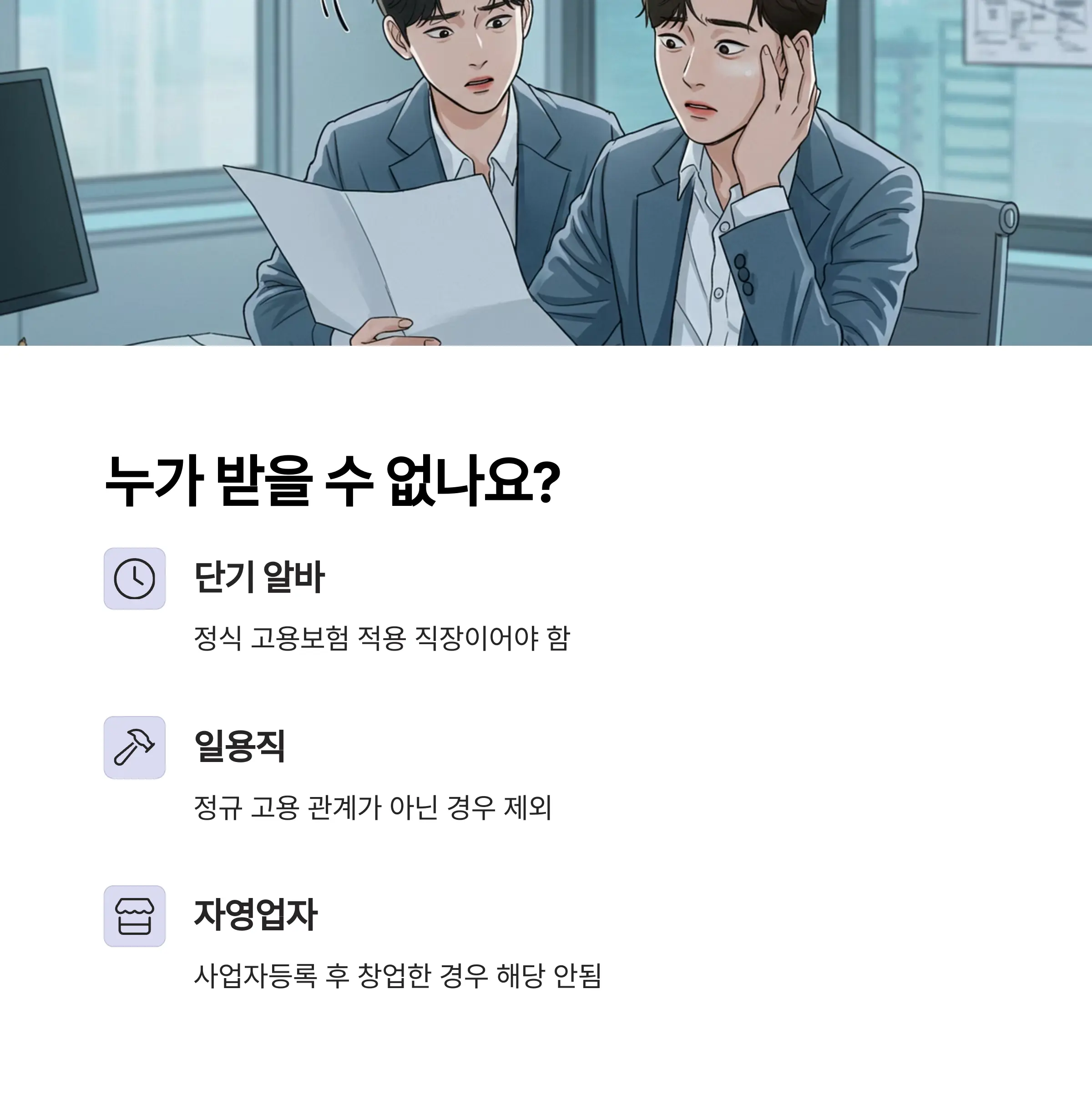 또한, 재취업한 일자리도 고용보험이 적용되는 정식 직장이어야 하며, 단기 알바, 일용직, 사업자등록 후 자영업자는 해당되지 않습니다.