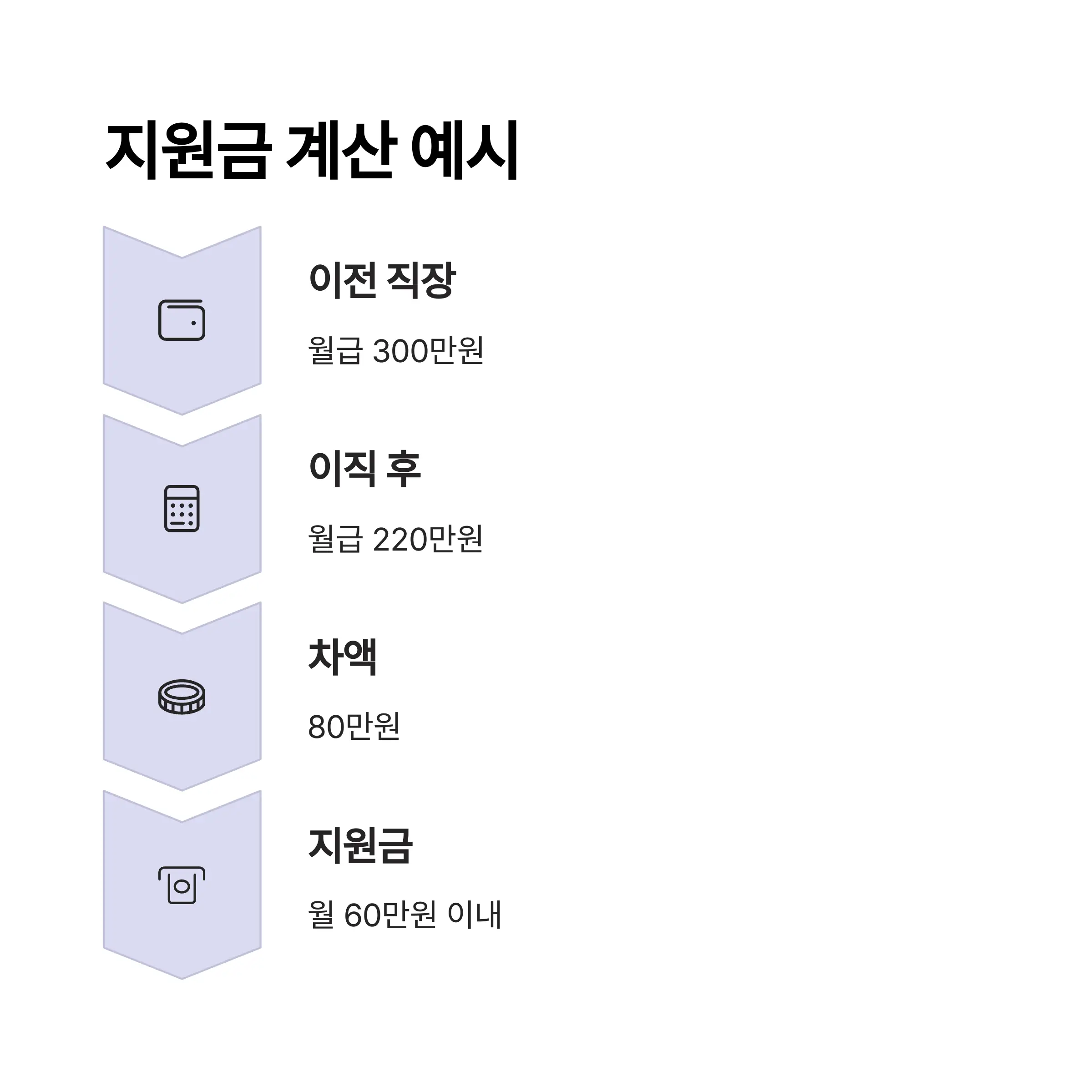 수당 금액은 간단히 말해, ‘이전 직장의 평균 월급’과 ‘재취업 후 월급’의 차액을 기준으로 계산됩니다. 다만, 차액 전액을 주는 것이 아니라 일부 비율로 보전됩니다.