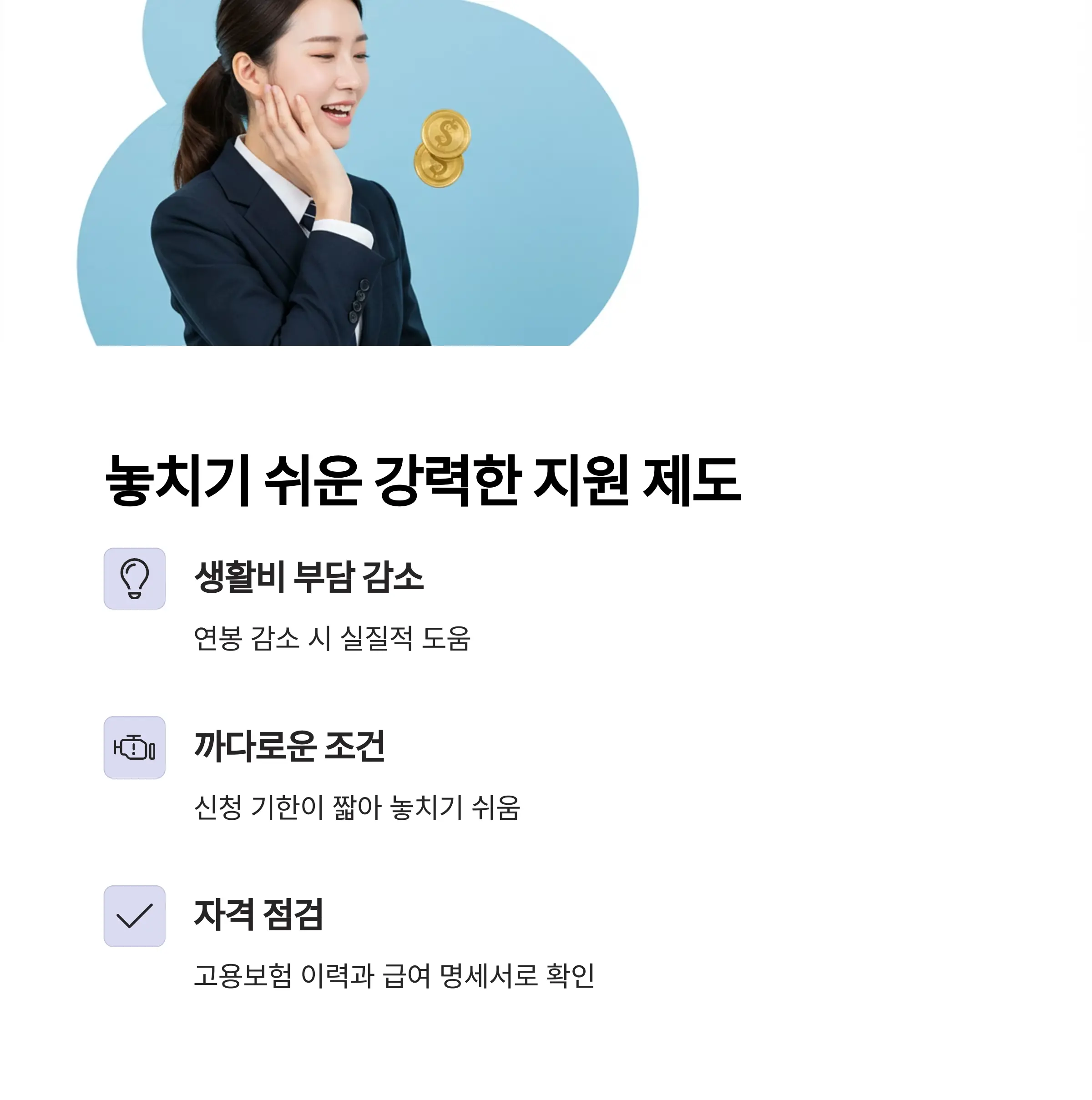 하지만 조건이 까다롭고, 신청 기한이 짧은 만큼 놓치기 쉬운 제도이기도 합니다. 이직 후 재취업까지 완료했다면, 지금이라도 고용보험 가입 이력과 급여 명세서를 기준으로 자격 요건을 점검해 보세요.