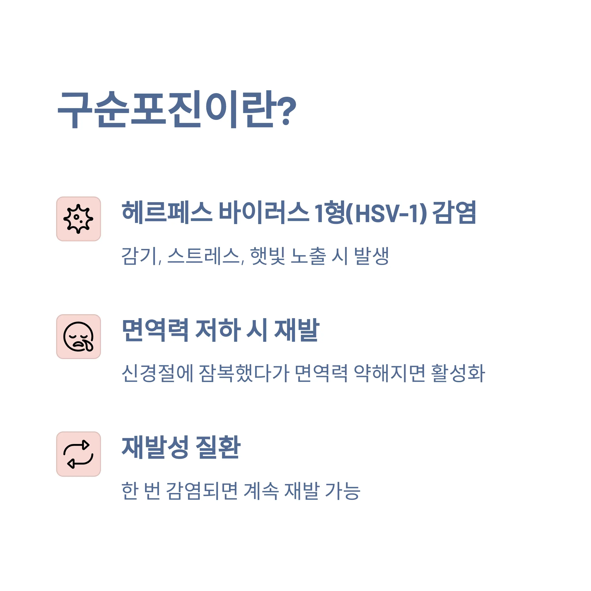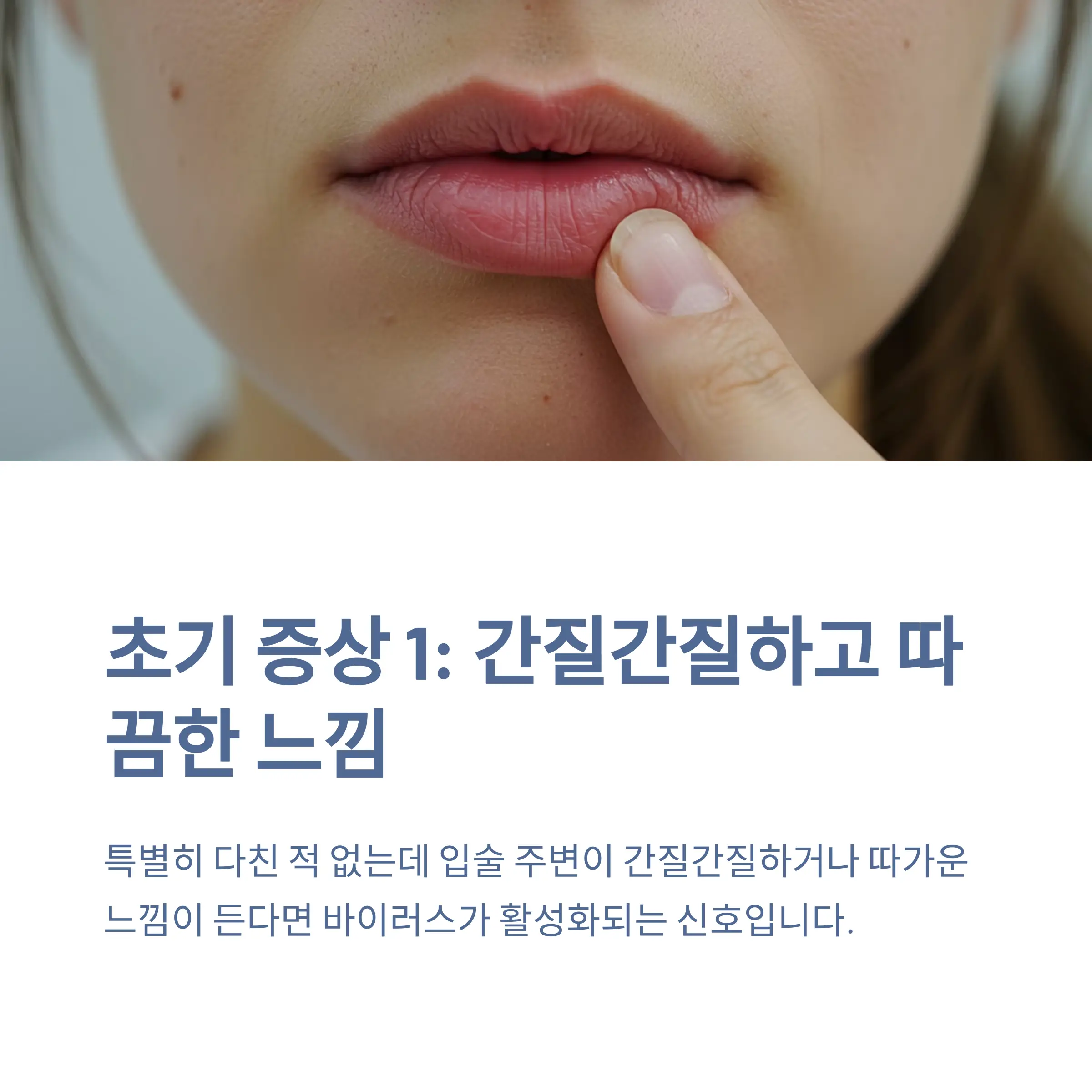 구순포진은 한 번 걸리면 평생 재발할 수 있는 바이러스성 질환입니다. 단순히 겉으로 물집이 생겼을 때가 아니라, 그 전에 이미 우리 몸은 신호를 보내고 있습니다. 이 초기 신호를 제대로 알고 있으면, 약을 쓰는 타이밍도 앞당길 수 있어 회복도 훨씬 빠릅니다.