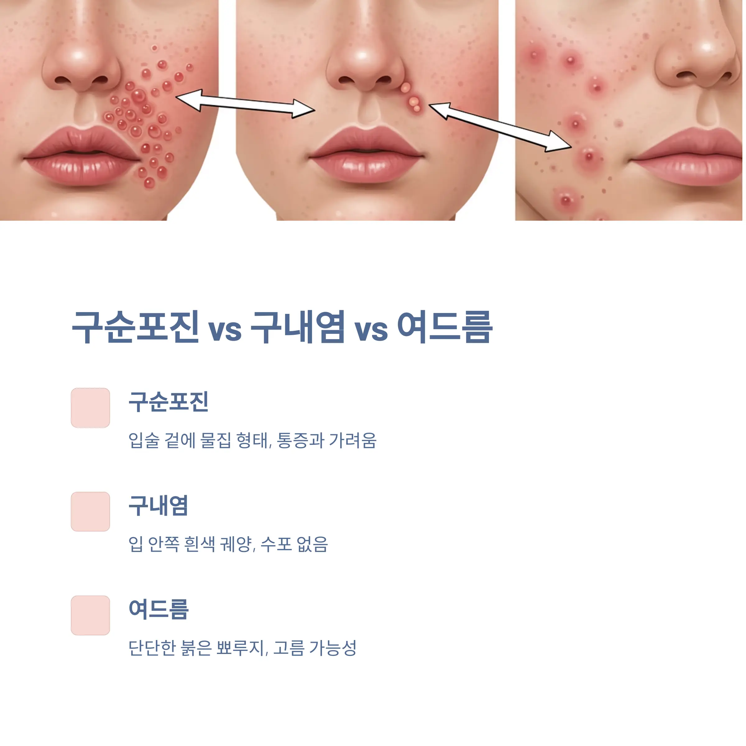 헷갈리기 쉬운 질환들이 있습니다. 구순포진은 입술 겉에 생기고, 수포(물집) 형태로 번져나가며 통증과 가려움이 동반됩니다.