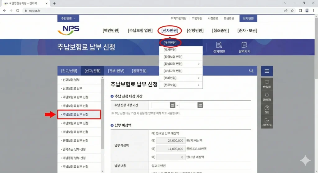 - 신고/신청: [신고/신청] 탭 선택 후 좌측 메뉴에서 [추납보험료 납부 신청]을 클릭합니다.