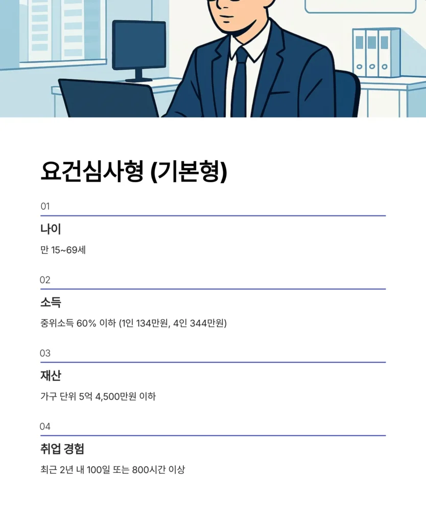| 핵심 조건 | 비자발적 퇴사 + 실업인정 | 소득/재산 기준 충족 |