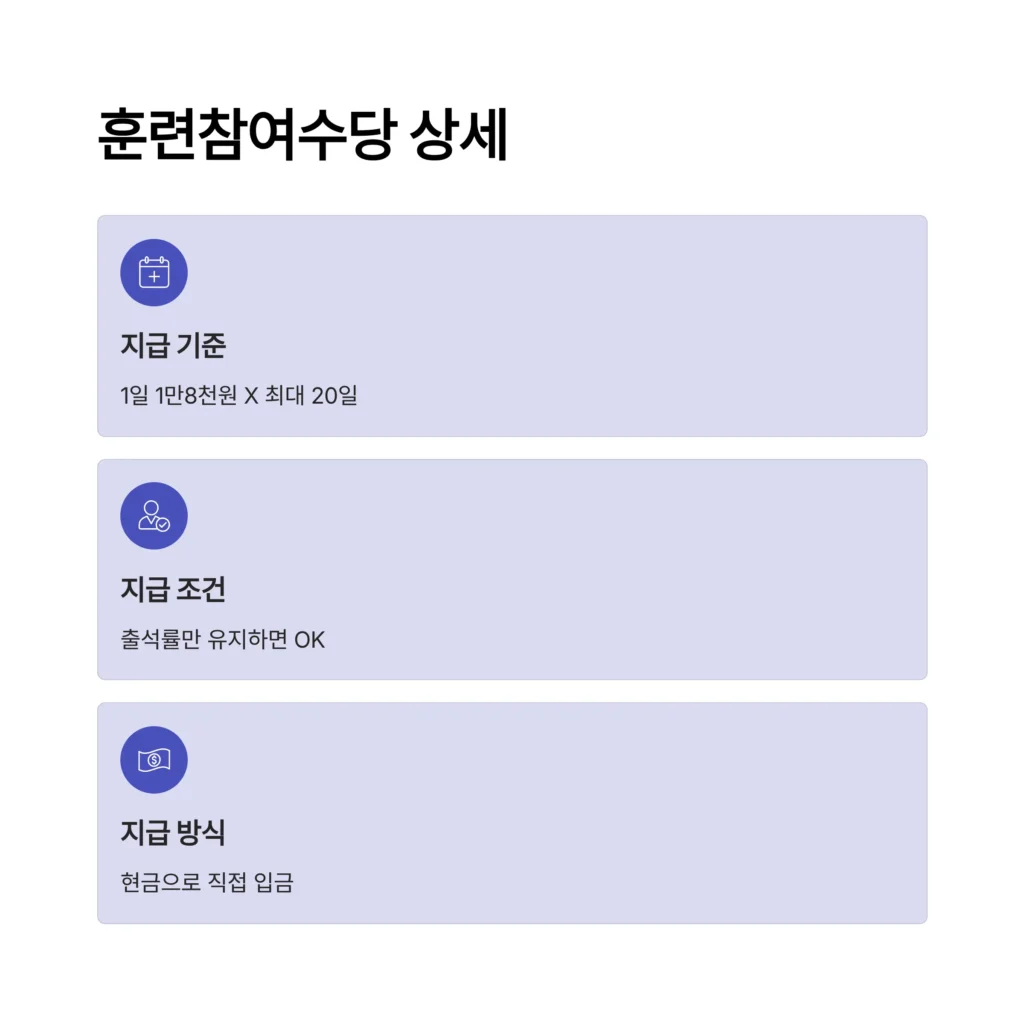 직업훈련 과정에 꾸준히 참여하면 식비∙교통비 명목으로 월 28만4천원(1일 기준 1만8천원, 최대 160시간 기준 X 20일 상당)을 받을 수 있습니다. 출석률만 유지하면 현금 형태로 지급됩니다.