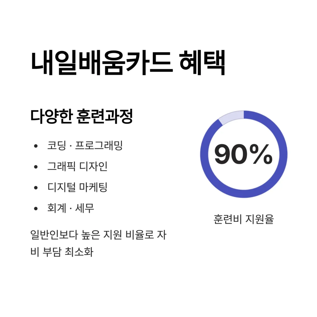 코딩, 그래픽디자인, 마케팅, 회계 등 다양한 훈련과정을 거의 무료로들을 수 있습니다. 국민취업지원제도 2유형 참여자는 일반인보다 훈련비 지원 비율이 높아 자비 부담이 크게 줄어듭니다.