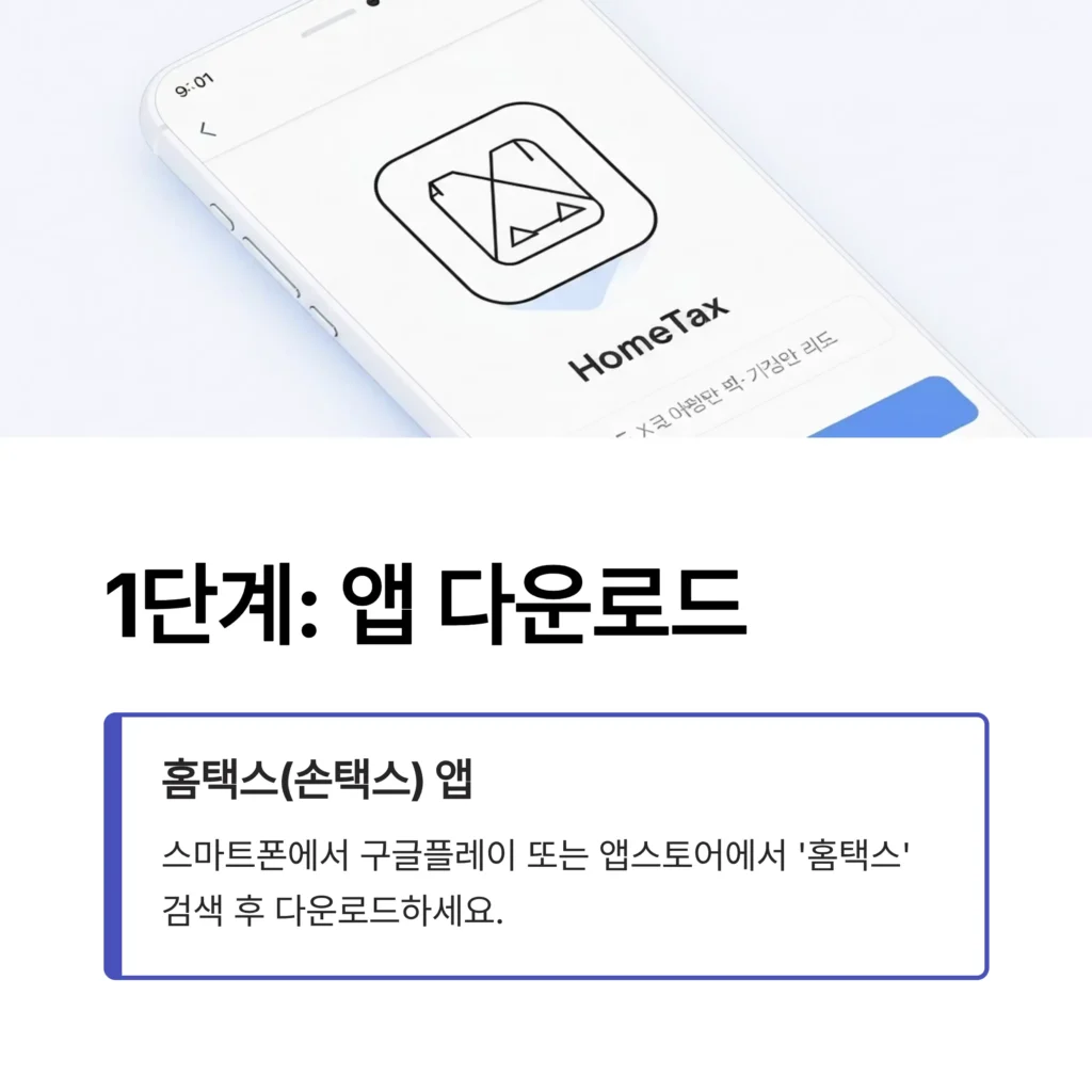 가장 먼저 스마트폰에 홈택스(손택스) 앱을 다운로드하고 접속해 주세요.
