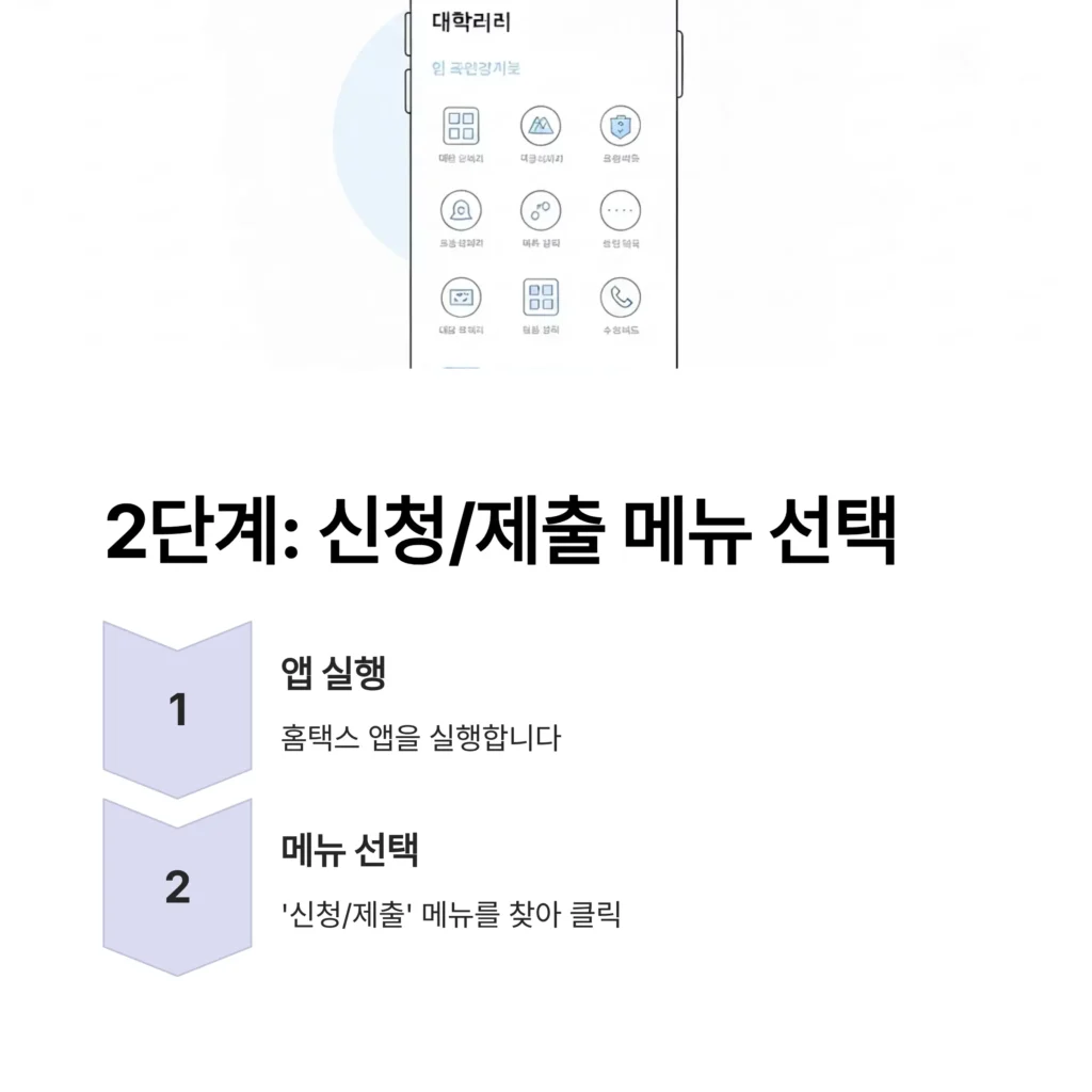 앱 초기 화면에서 ‘신청/제출’ 메뉴를 찾아 들어갑니다.