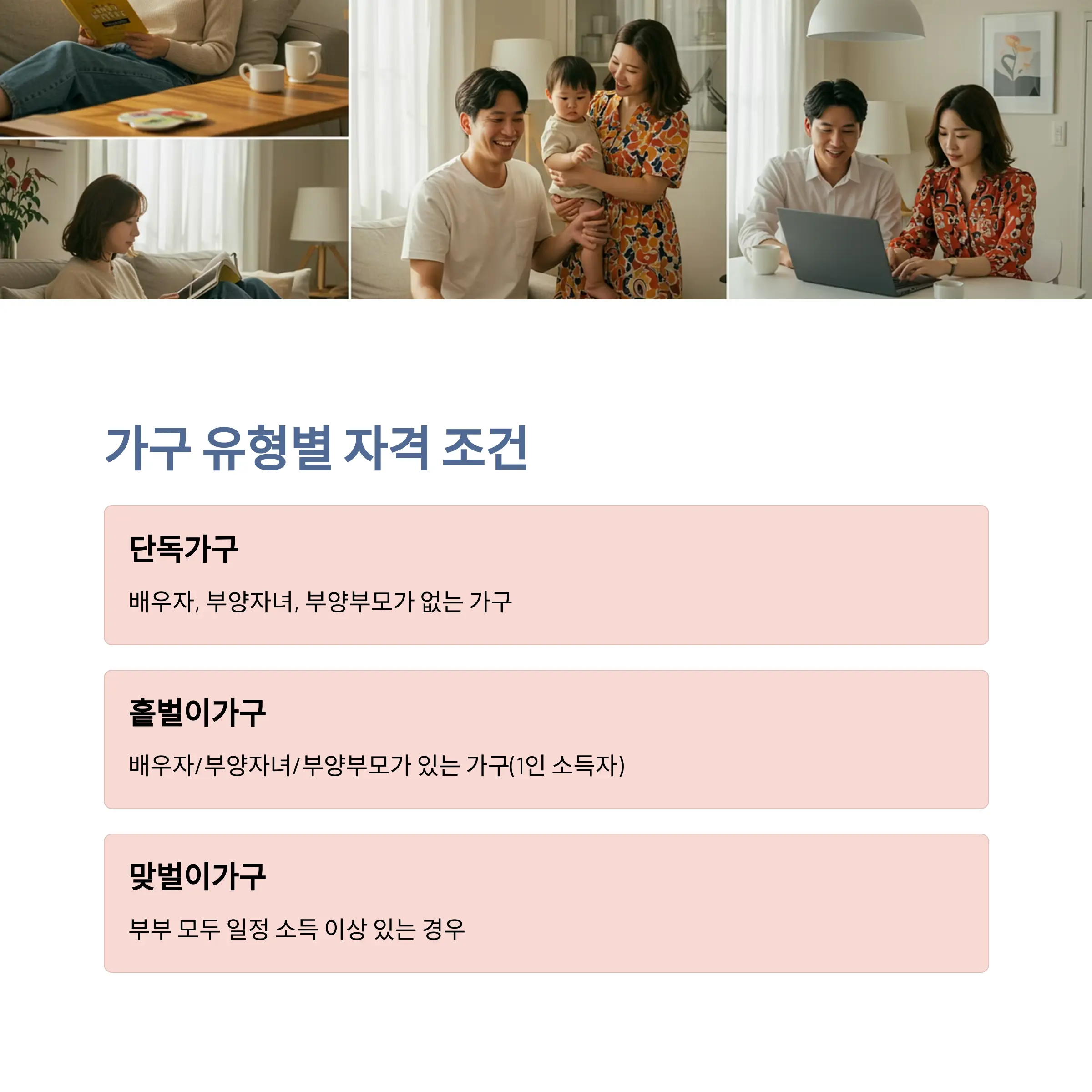 가구 형태에 따라 지원 요건과 금액이 달라지기 때문에, 본인의 가구 유형을 정확히 파악하는 것이 가장 먼저 해야 할 일입니다.