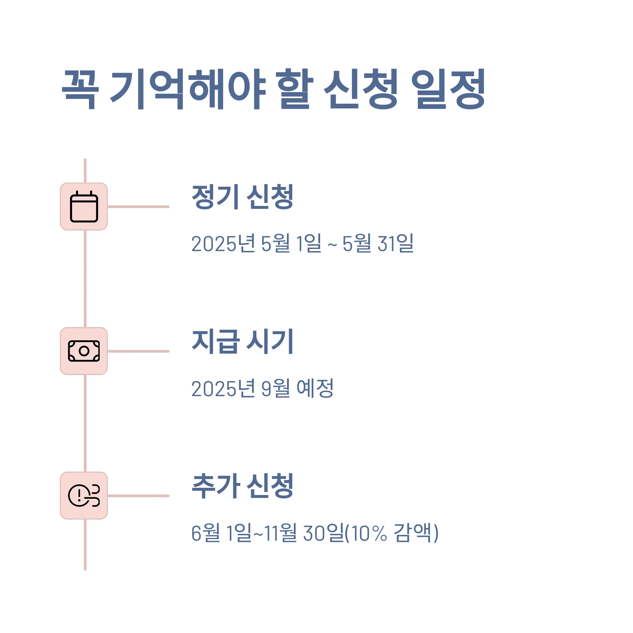 - 추가 신청 기간: 2025년 6월 1일 ~ 11월 30일 (지급액 10% 감액)