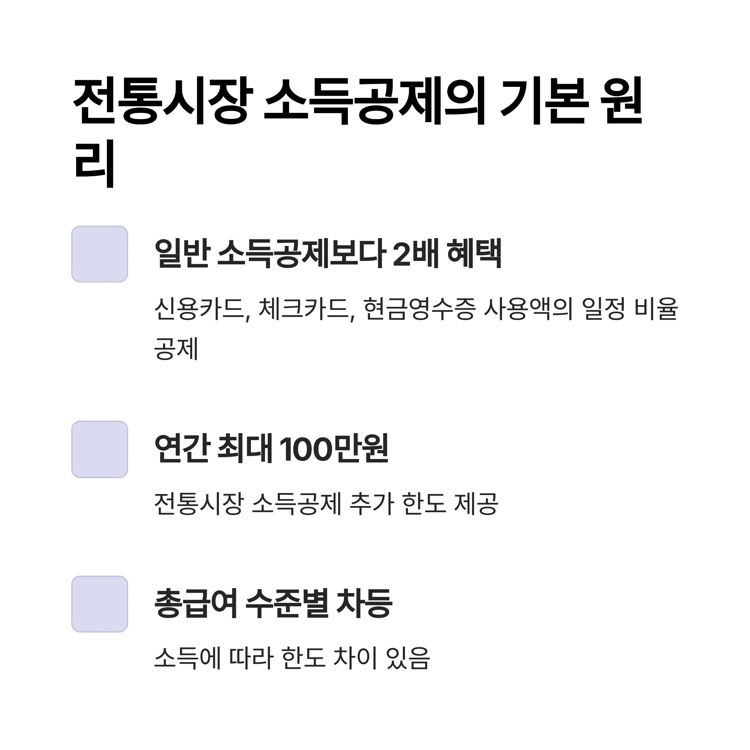 • 연간 최대 100만원까지 전통시장 소득공제 한도가 추가 제공됩니다. (총급여 수준에 따라 일부 차이 있음)