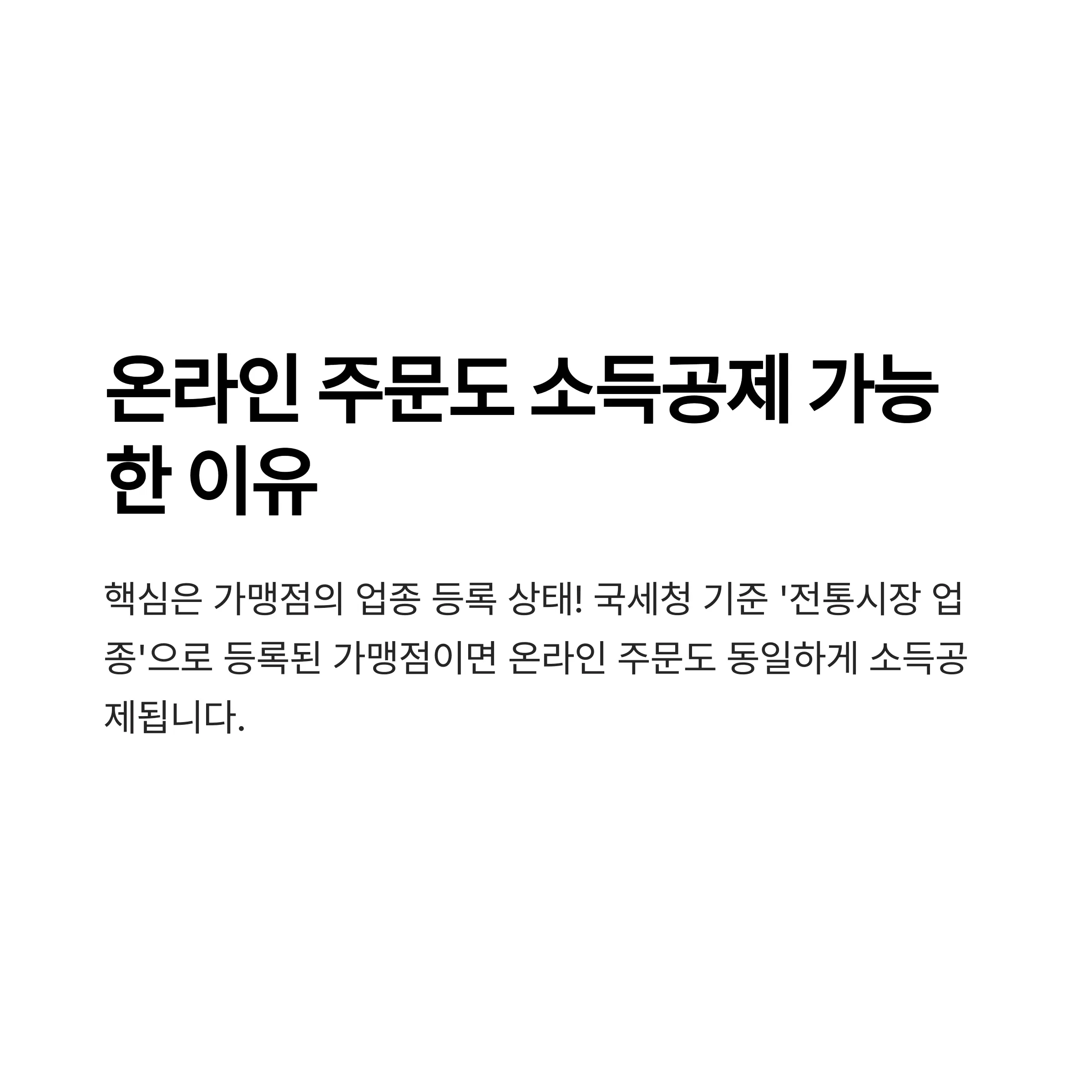 실제 구매 방식이 현장 방문인지, 온라인인지보다 중요한 건 가맹점의 업종 등록 상태입니다. 국세청 기준으로 가맹점 업종코드가 ‘전통시장 업종’으로 등록돼 있으면 온라인 주문도 동일하게 소득공제가 가능합니다.