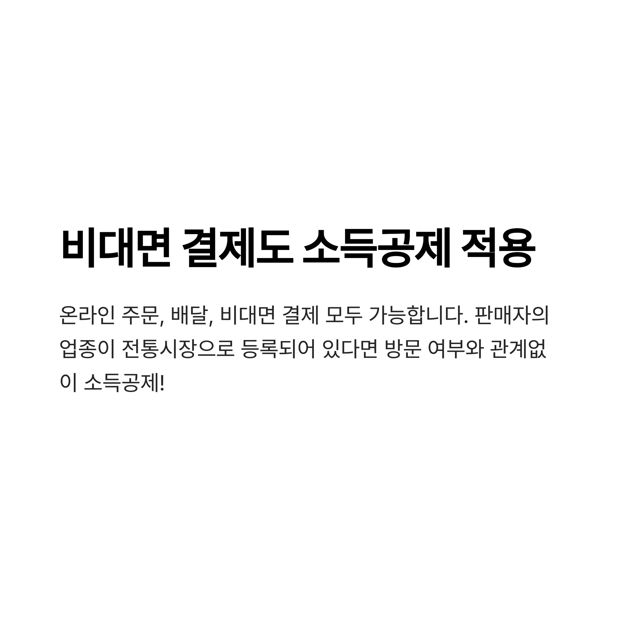 • 판매자의 업종이 전통시장으로 등록돼 있으면 온라인 주문, 배달, 비대면 결제 모두 소득공제 가능합니다.