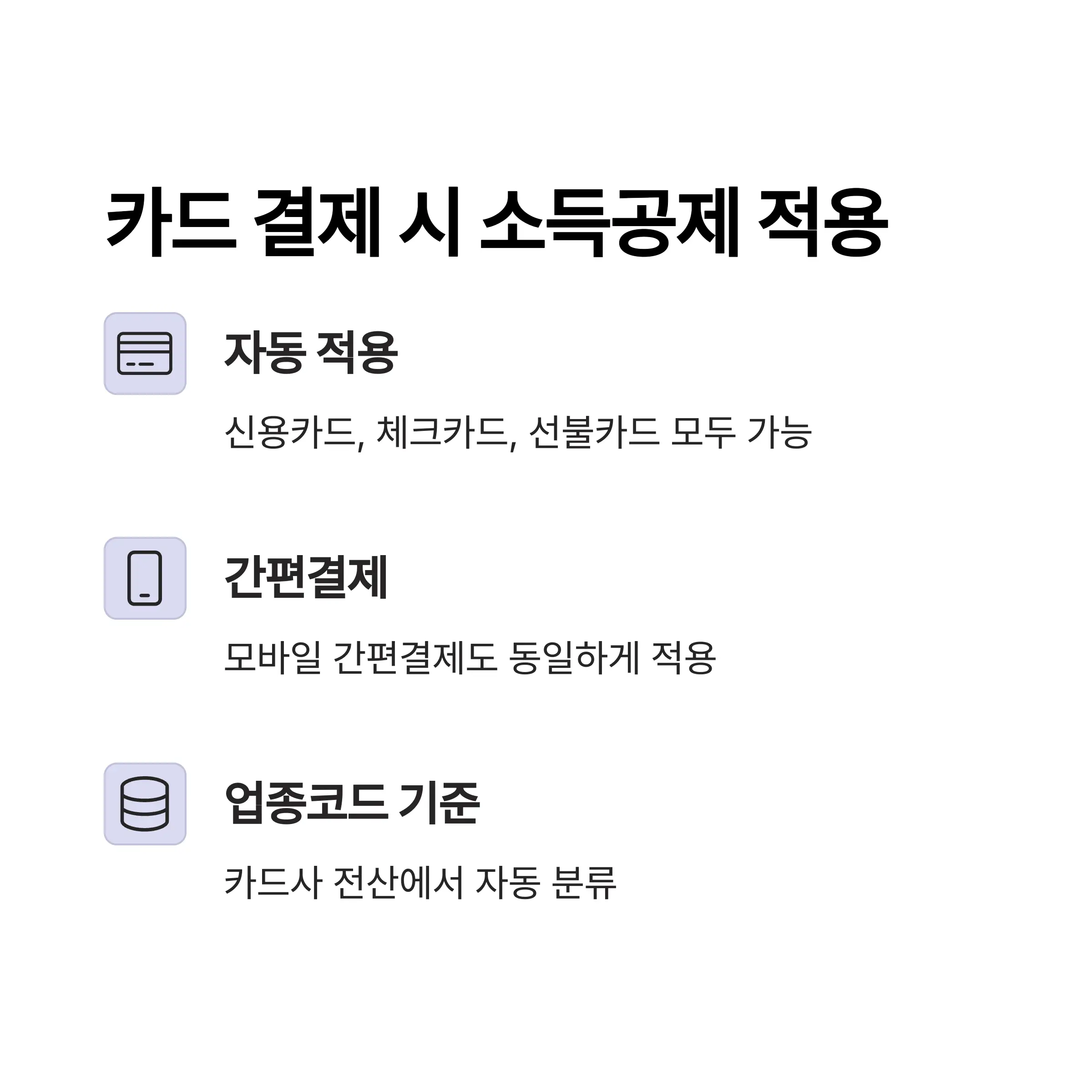 • 카드사에서 결제 정보가 국세청에 전달될 때 이 업종코드가 자동 포함되므로 별도 신청 없이도 연말정산 시 소득공제 자료에 반영됩니다.