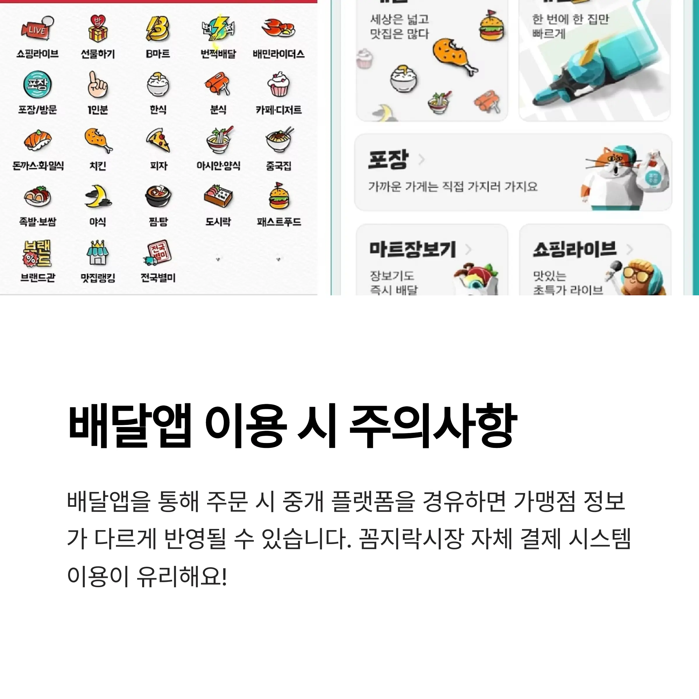 • 배달앱을 통해 주문하면서 중개 플랫폼을 경유할 경우 가맹점 정보가 다르게 반영될 수 있습니다.
