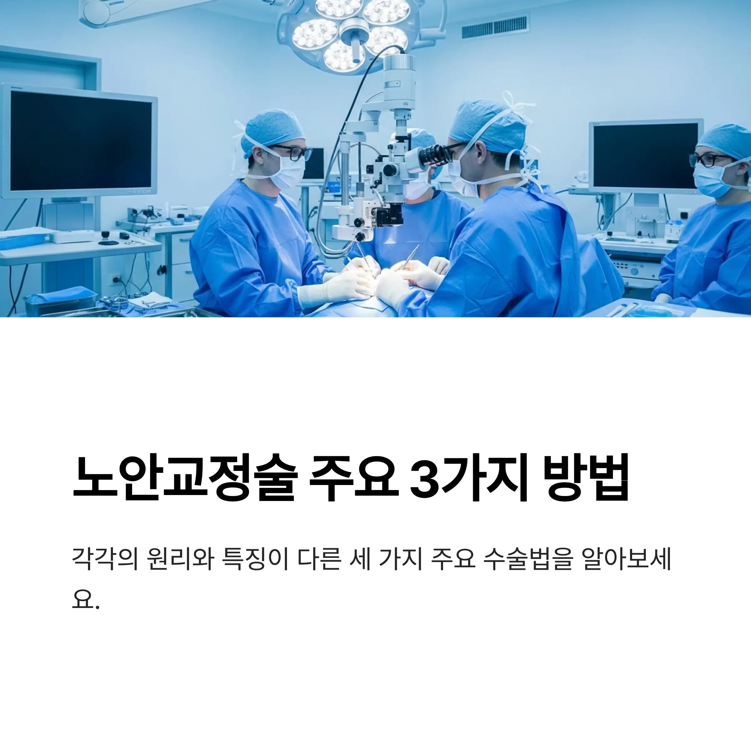 노안교정술은 크게 세 가지 주요 방법으로 나눌 수 있으며 각각의 원리와 특징이 다릅니다.