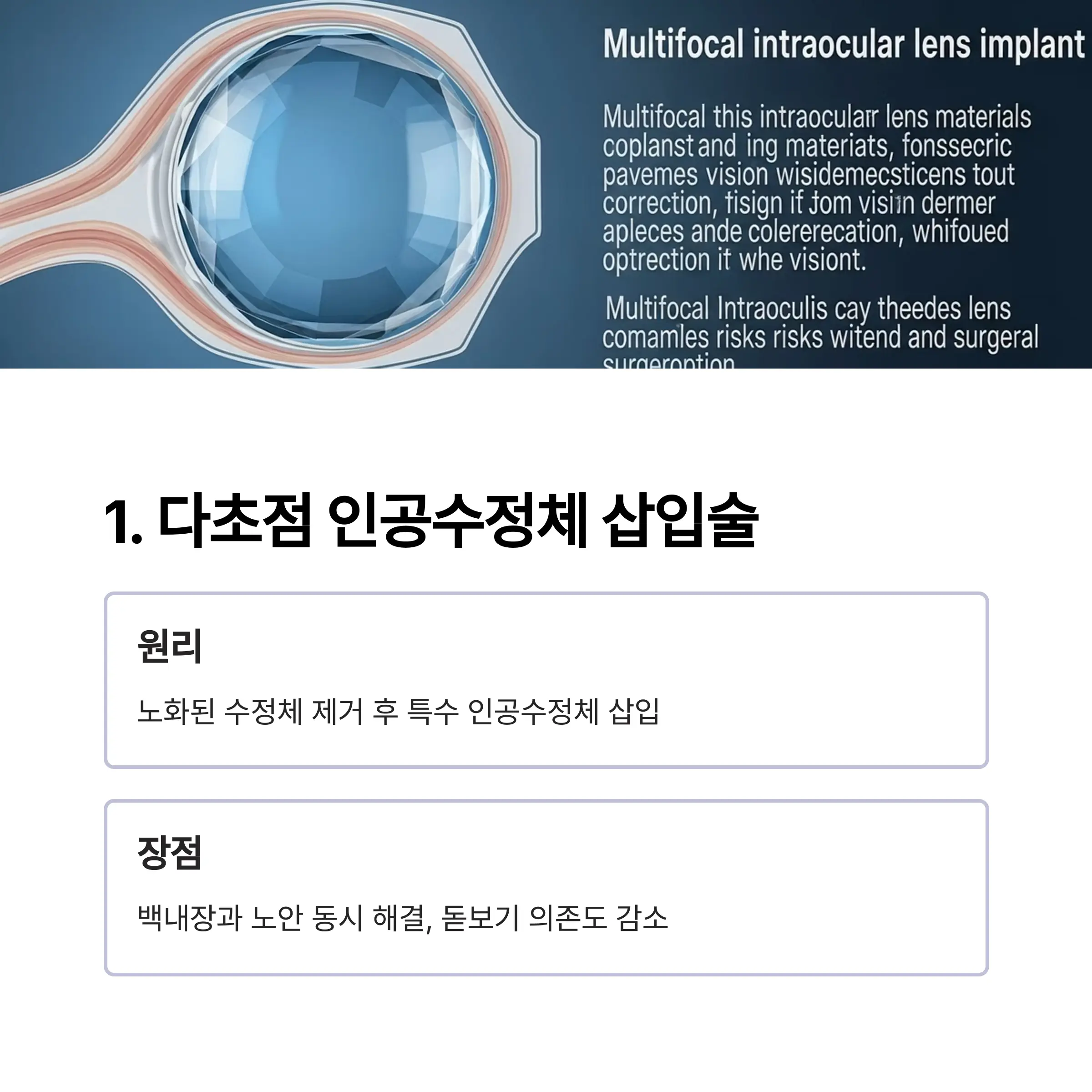 • 장점: 백내장과 노안을 한 번에 해결, 돋보기 의존도를 크게 줄여줌.