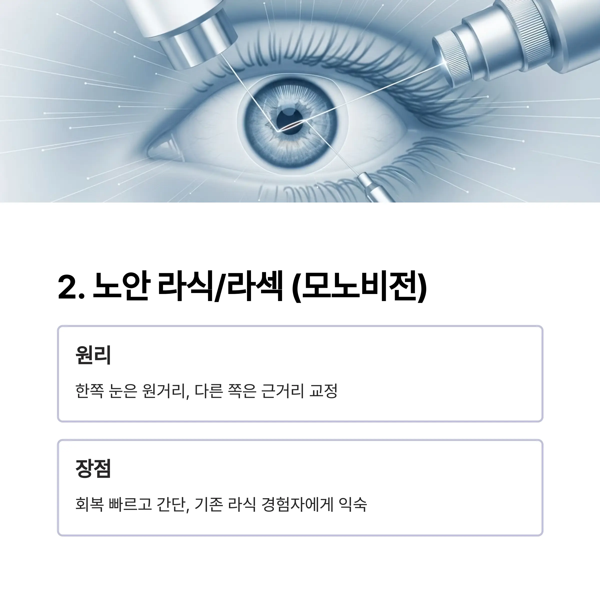 • 레이저를 이용하여 각막을 깎아 시력을 교정하는 라식/라섹의 원리를 노안에 적용한 것입니다. 주로 한쪽 눈은 원거리를, 다른 한쪽 눈은 근거리를 잘 보이도록 교정하는 ‘모노비전’ 방식이 대표적입니다. 뇌가 두 눈의 시력 차이에 적응하도록 유도합니다.