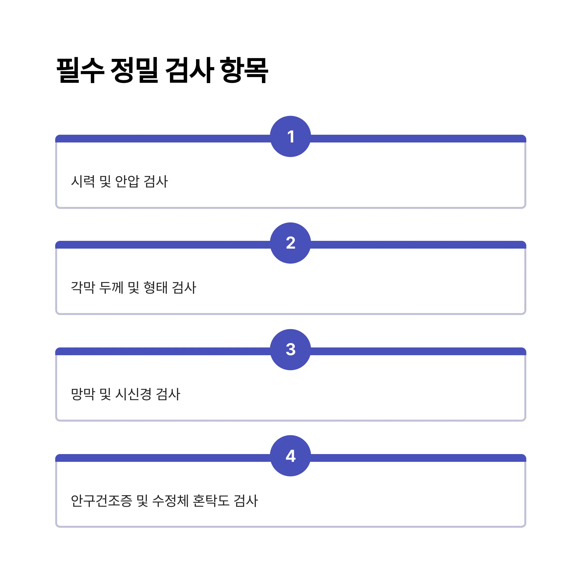 • 수정체 혼탁도 검사: 백내장 동반 여부 및 정도 확인.