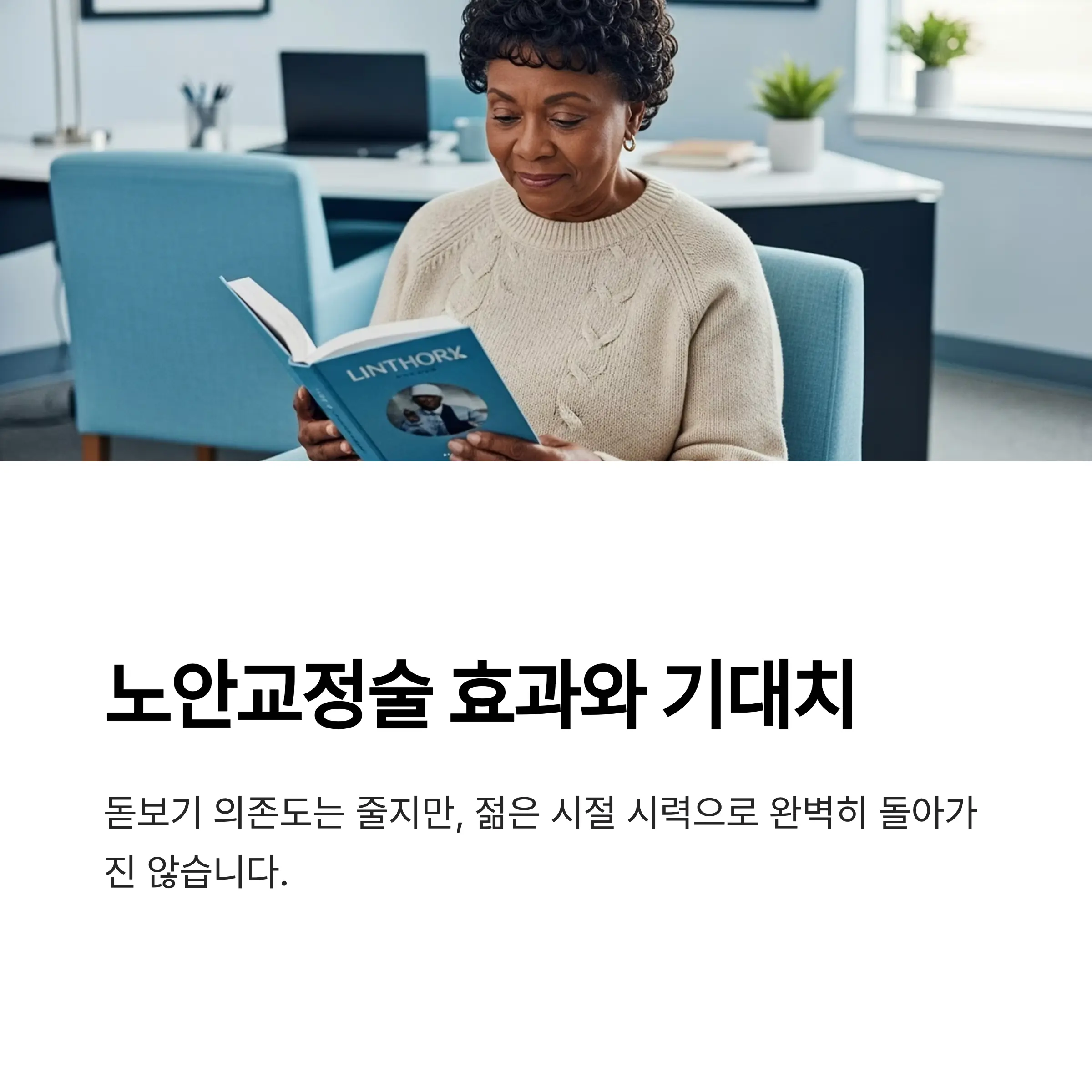 노안교정술은 돋보기 의존도를 크게 줄여주지만 ‘젊은 시절의 시력’으로 완벽하게 돌아가는 것은 아닙니다. 현실적인 기대치를 갖는 것이 중요합니다.
