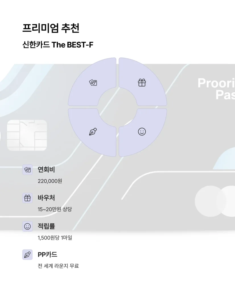 • 핵심 혜택: 15~20만원 상당의 바우처 (호텔, 상품권 등 택1, 연1회), 전 세계 공항 라운지 무료 (PP카드 제공)