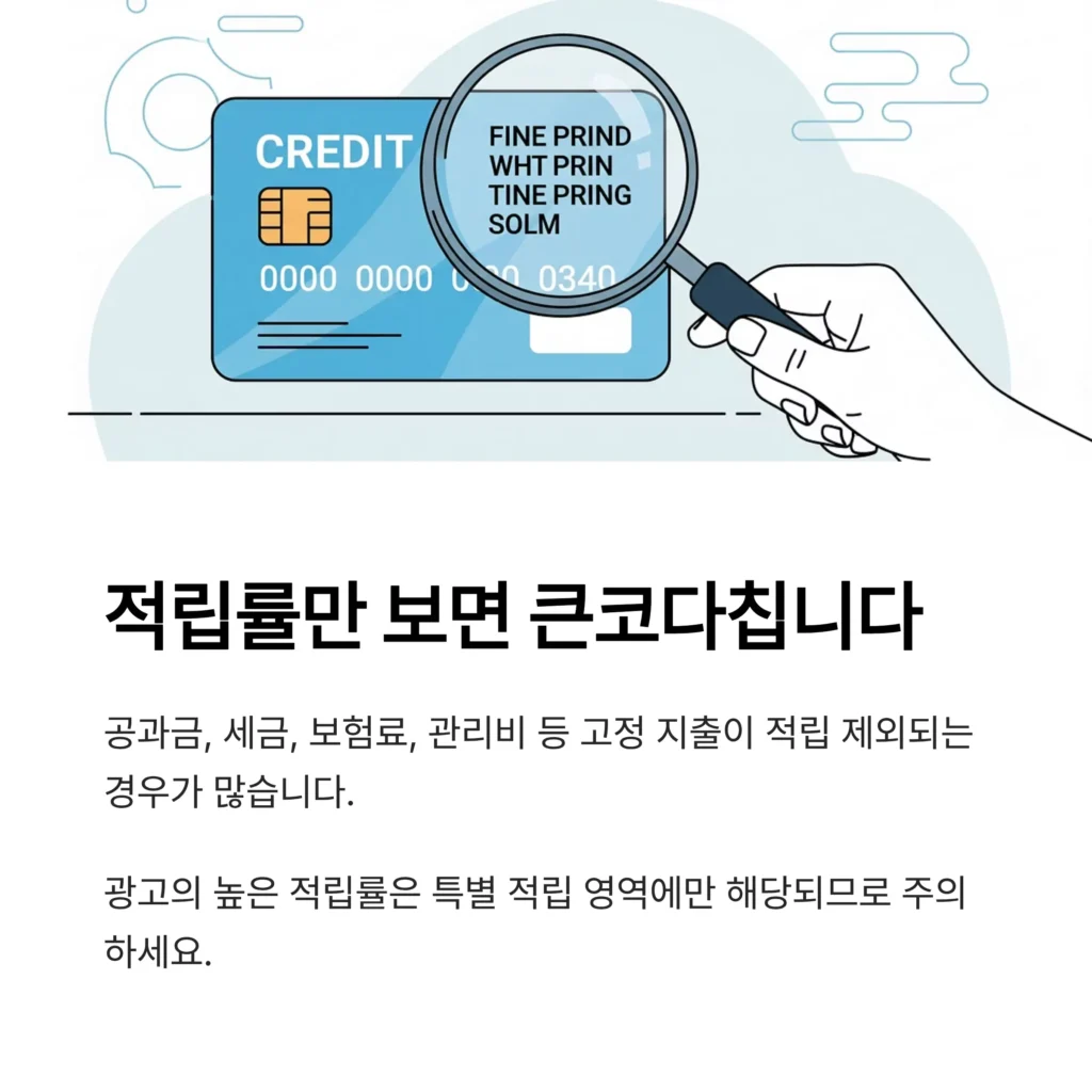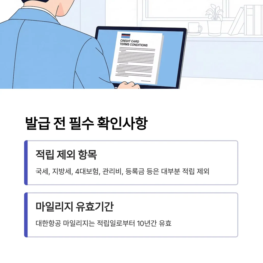광고에 나오는 높은 적립률은 대부분 특별 적립 영역에만 해당되는 경우가 많습니다. 더 중요한 것은 내가 월급처럼 고정적으로 지출하는 공과금, 세금, 보험료, 아파트 관리비 등이 마일리지로 적립되는지 여부입니다. 대부분의 카드는 이 항목들을 적립 제외하고 있어 실제 적립되는 마일리지는 예상보다 훨씬 적을 수 있습니다.