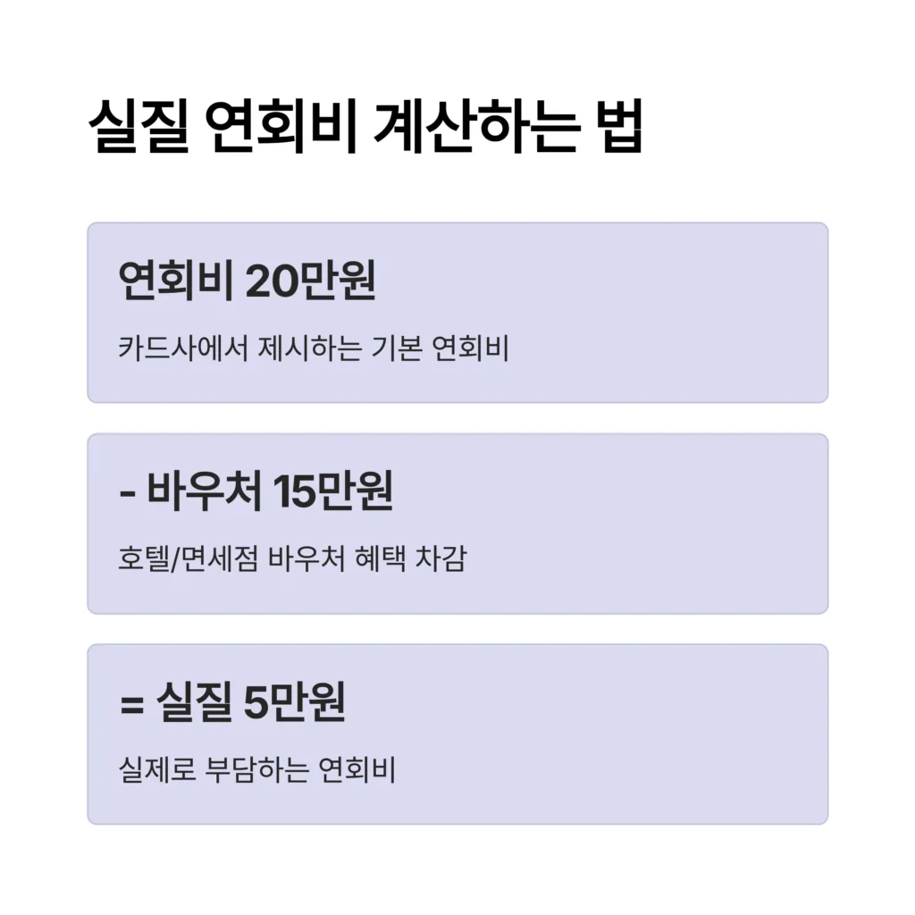 연회비 20만원짜리 카드. 비싸 보이지만 15만원짜리 호텔/면세점 바우처를 준다면? 내가 실제로 부담하는 실질 연회비는 5만원인 셈입니다. 단순히 연회비 숫자만 보지 말고 내가 100% 활용할 수 있는 바우처 혜택을 빼서 실질적인 비용을 계산해야 합니다.