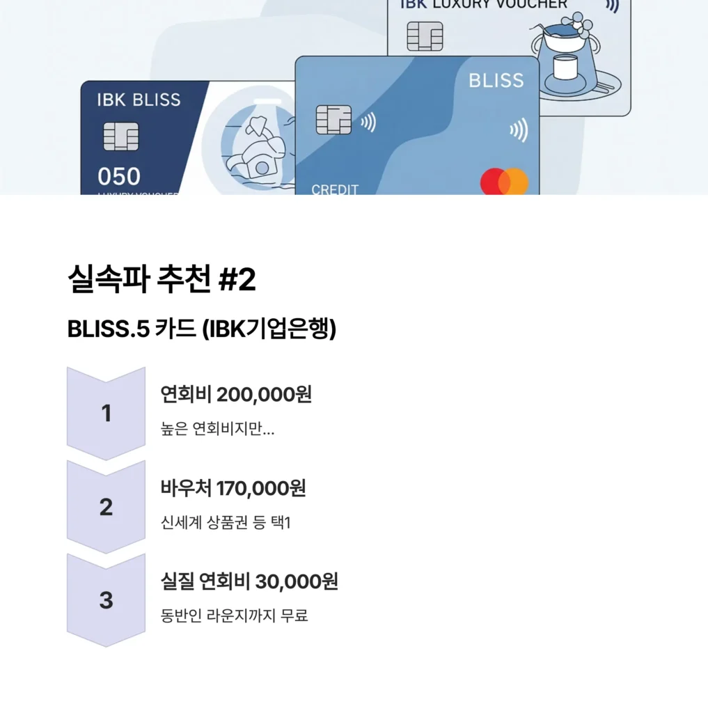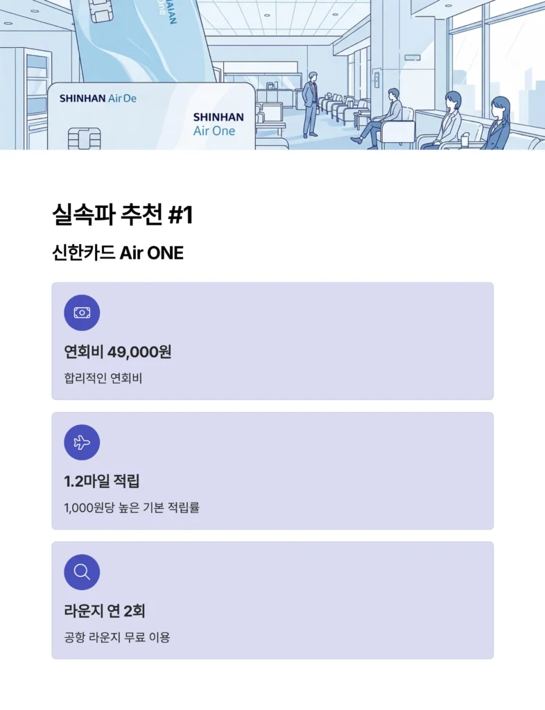 • 추천 이유: 20만원 연회비가 17만원 상당의 바우처로 상쇄되어 실질 연회비는 3만원입니다. 매우 저렴한 비용으로 동반인까지 라운지 혜택을 누릴 수 있어 가성비가 매우 뛰어납니다.